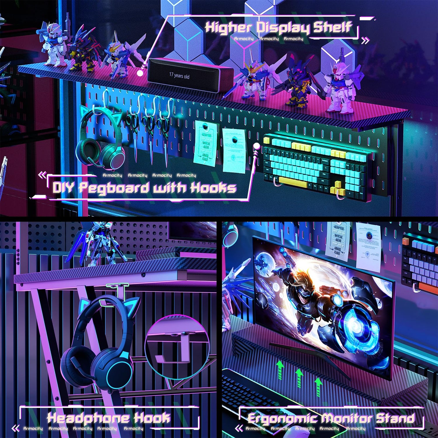 - TONS OF TABLE SPACE - Armocity gaming desk with hutch and storage shelves has plenty of room for gaming consoles and miscellaneous swag. It's enough to hold laptops and monitors as well as miscellaneous paperwork and other sundry items. Additional DIY pegboard (with 4 s hooks) will be a space saver assistant and give it a cool and standout look.