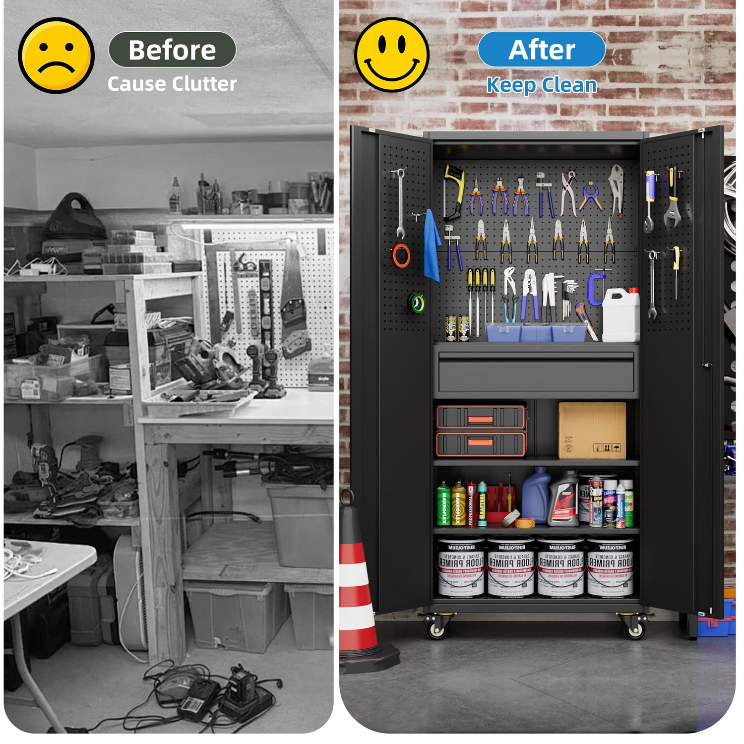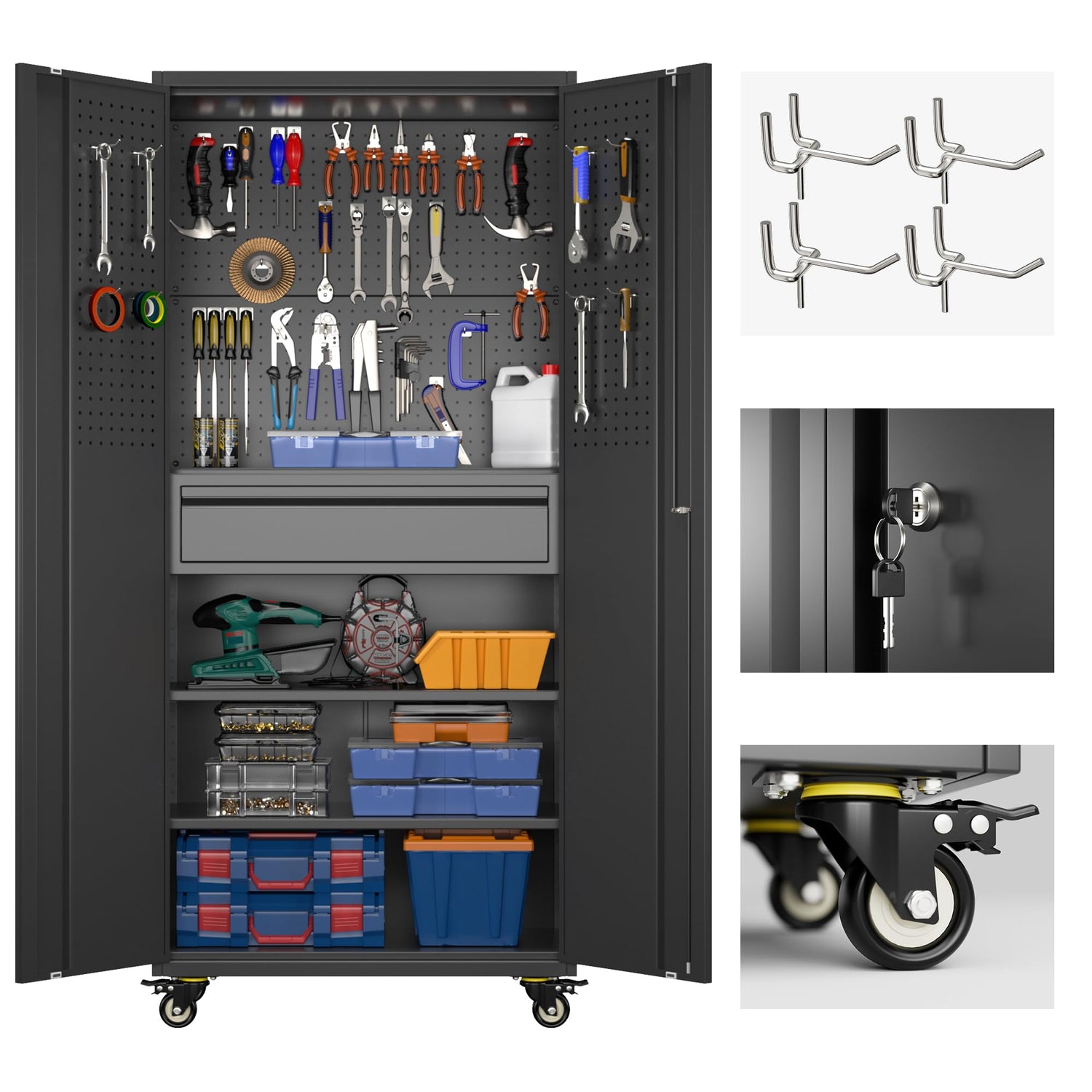 - Upgrade and Practical Design: This metal storage cabinet with wheels features the latest design and comes with a range of practical accessories to enhance storage space: pegboard, pegboard on side panels, 16 hooks; towel hangers ; 2 adjustable shelves; magnetic doors, making it an ideal choice for storing tools, cleaning supplies, and everyday essentials;