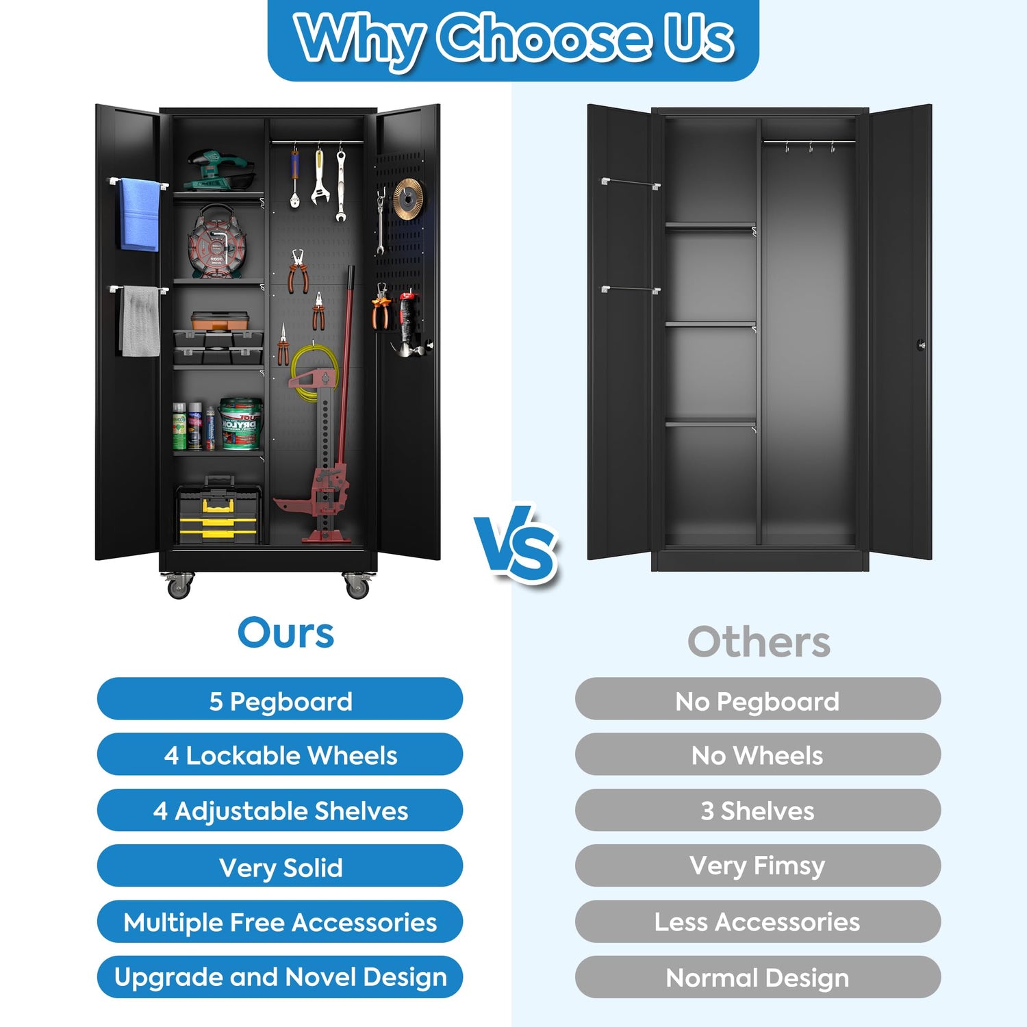 - Upgrade and Practical Design: This garage closet storage cabinet features the latest design and comes with a range of practical accessories to enhance storage space:5 pegboard, pegboard on side panels, 10 hooks; hanging rod and towel hangers with hanging hooks; 4 adjustable shelves; making it an ideal choice for storing tools, cleaning supplies, and everyday essentials;
