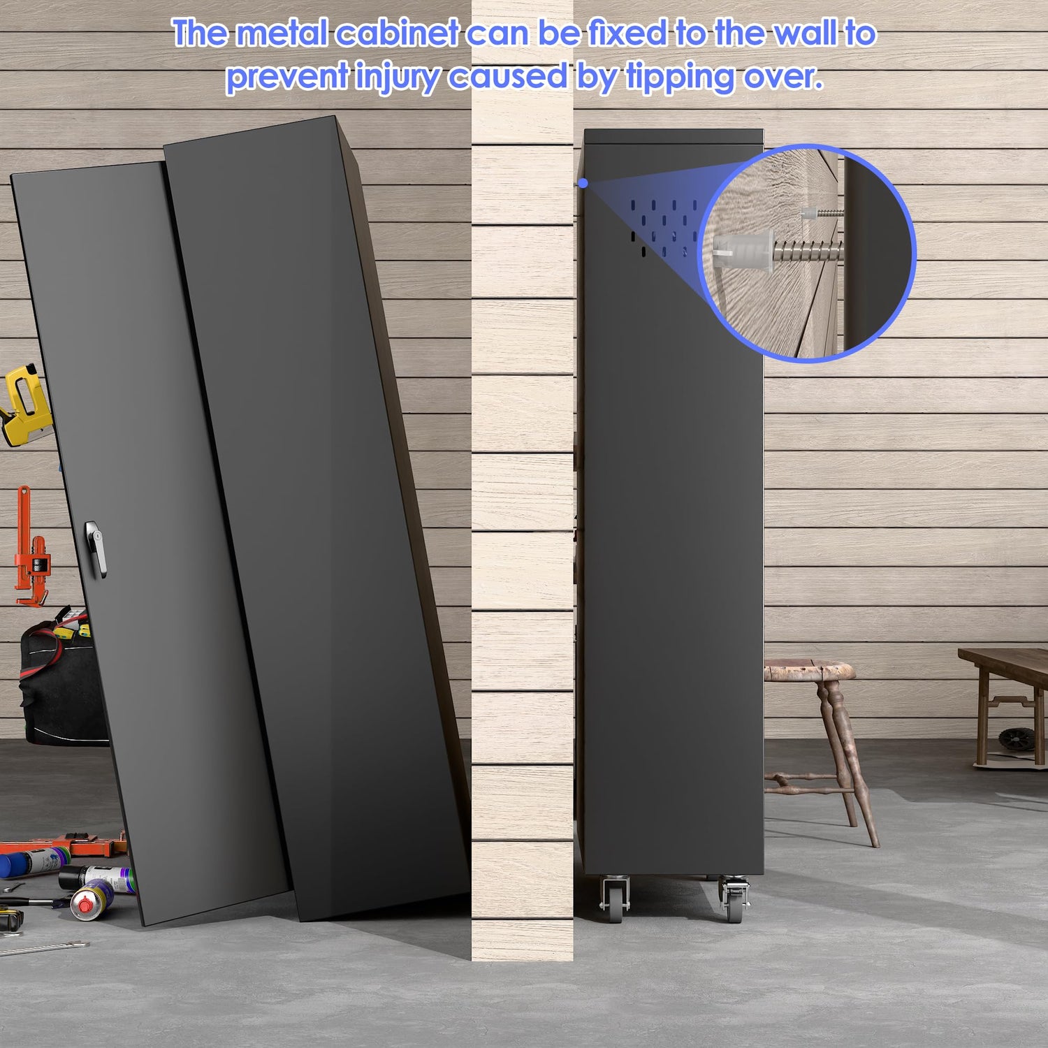 - 360 Degree Rotation Quiet & Lockable Castors: This broom closet storage cabinet come with 4 rubber casters (doesn't hurt wood/ceramic floors), two of which can be locked, giving you the freedom to move the garage cabinet to where you want to store it.;