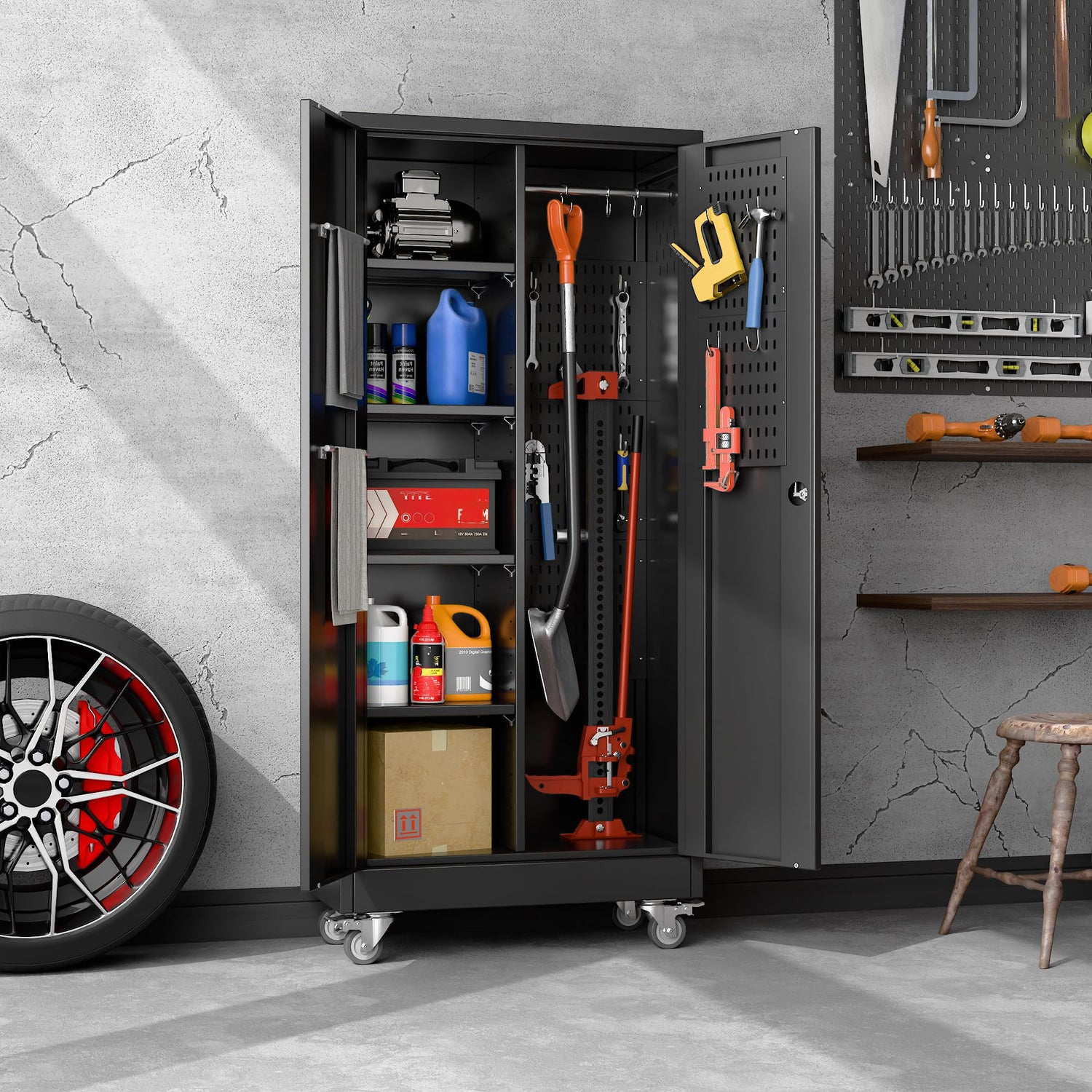- Upgrade and Practical Design: This garage storage cabinet features the latest design and comes with a range of practical accessories to enhance storage space:5 pegboard, pegboard on side panels, 10 hooks; hanging rod and towel hangers with hanging hooks; 4 adjustable shelves; making it an ideal choice for storing tools, cleaning supplies, and everyday essentials;