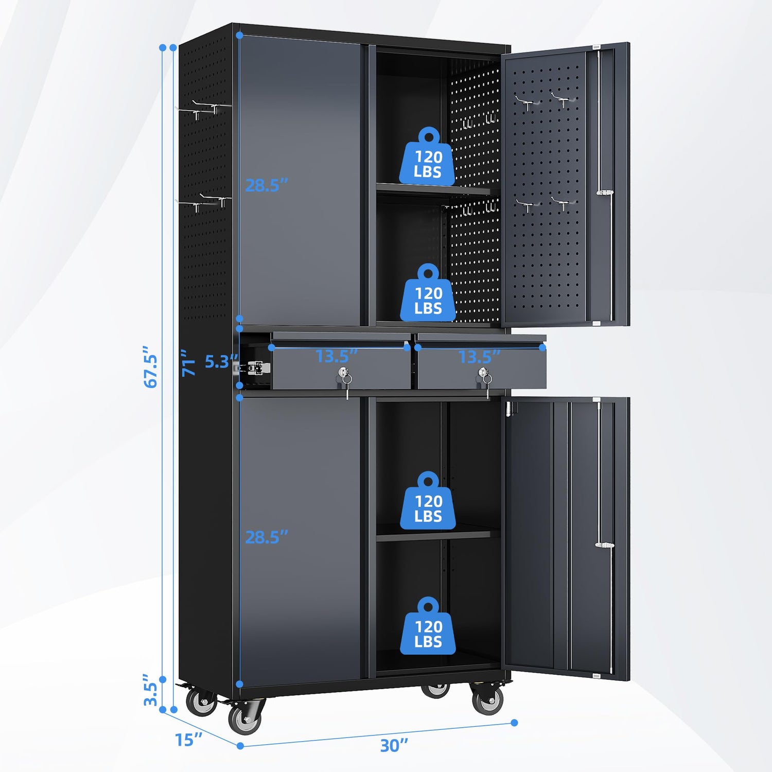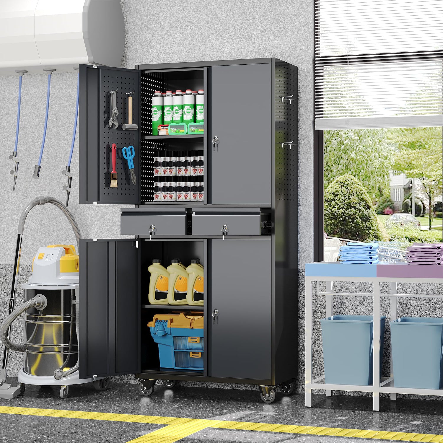 - Utility Pegboard & Adjustable Shelves: Redesign your organizing ways, hang up everything on the door and the side, get effortless accessible for a variety of small hardware, no more searching for things among the clutter. Tall Garage storage cabinet with wheels is designed with 2 adjustable shelves, you can easily meet your different storage needs by adjusting the height between the shelves.