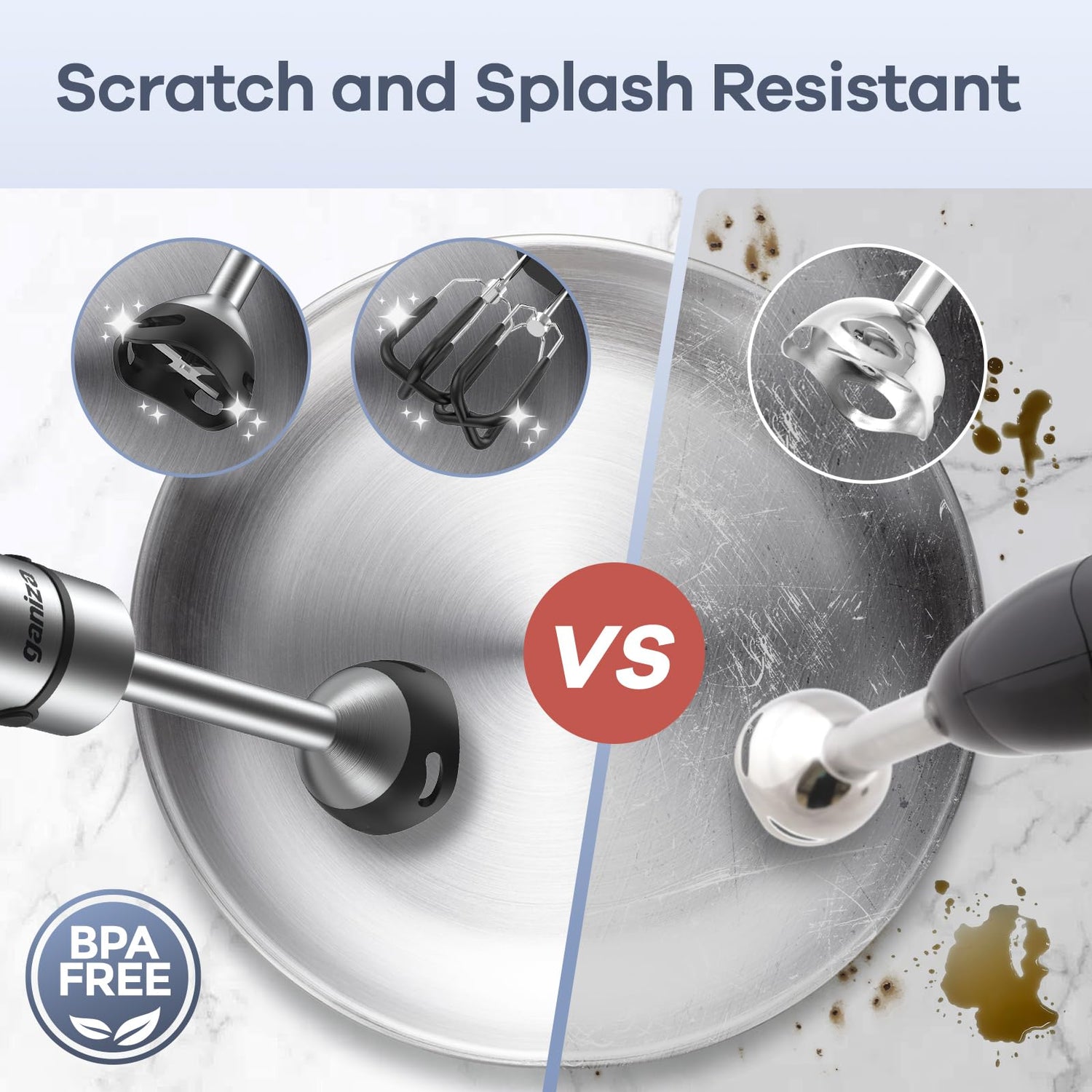 - Froth and Mix in a Flash: With the patented dual-rod frothing system, Ganiza corded handheld blender froths 200ml of milk into rich foam in just 20-30s—6x faster than others. The upgraded anti-scratch dual-rod whisk whips eggs 4x faster without scratching bowls and doubles as a hand mixer for batter, dough, and more.