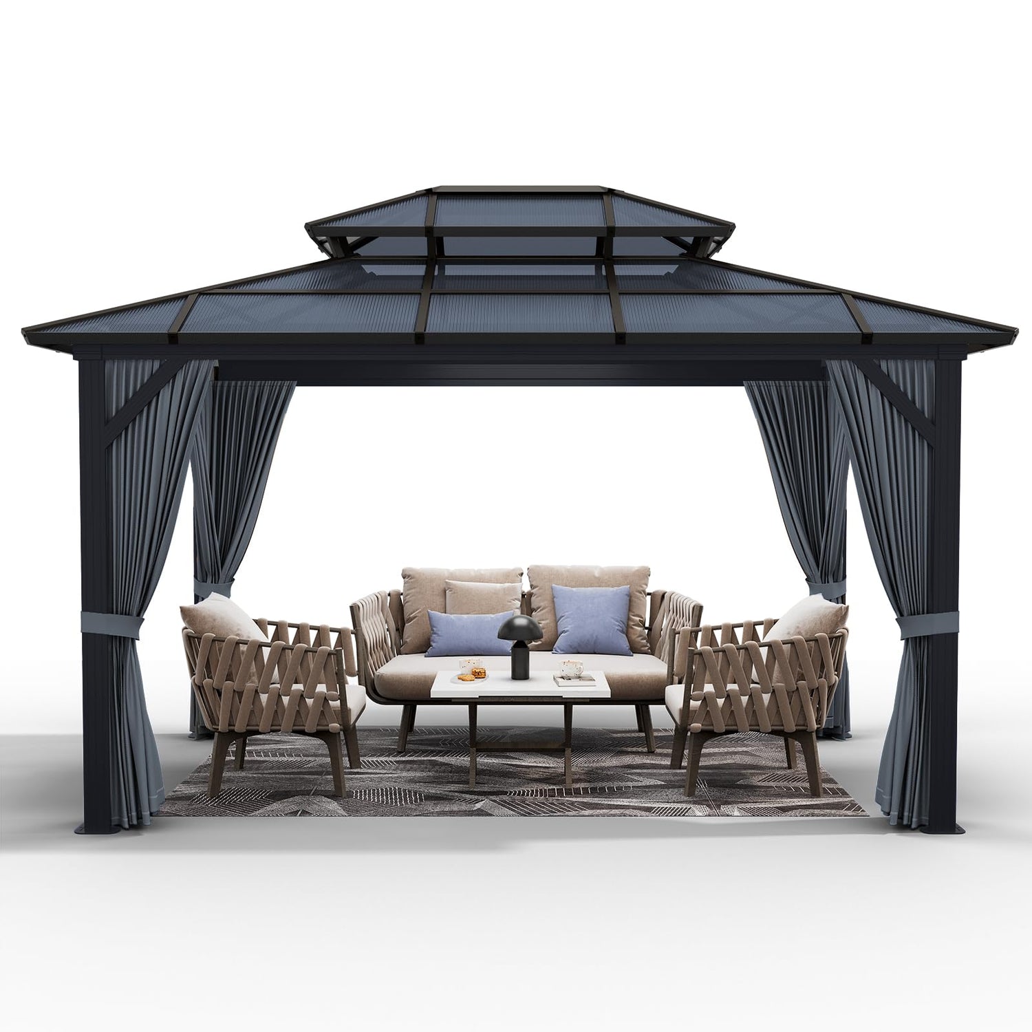 - DURABLE POLYCARBONATE TOP: This all season gazebo made of polycarbonate roof protects against bad weather during outdoor activities; the heat insulation layer blocks 99% of harmful UV rays and reduces heat and strong light; Sleek roof slope design also prevents rain from gathering.