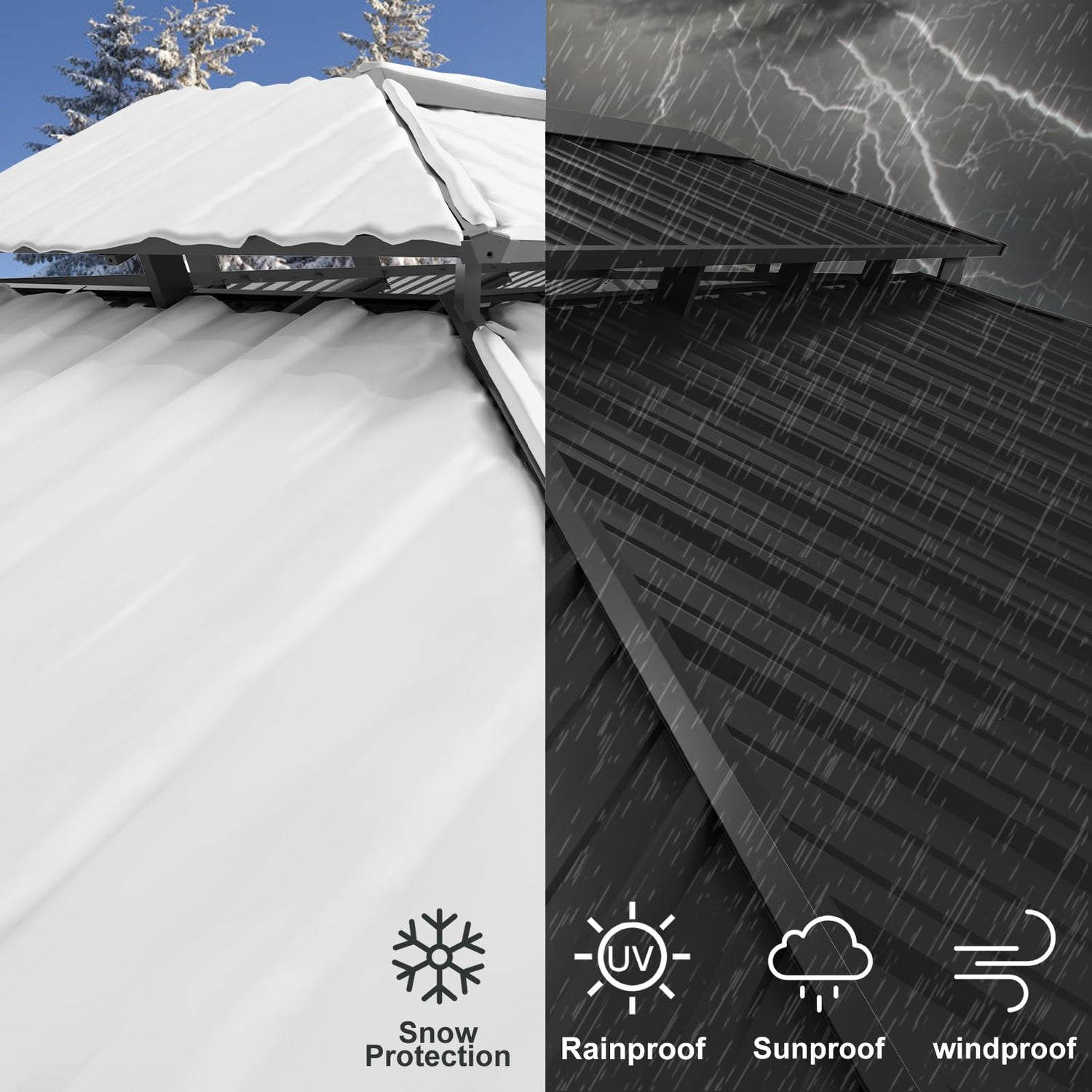 - Durable Hardtop Gazebo: This gazebo boasts a sturdy galvanized steel and aluminum frame for longevity. Featuring triangular powder-coated aluminum frame for enhanced stability,The double-roof hard top is weatherproof, fade-proof, and rust-proof, making it ideal for year-round use.