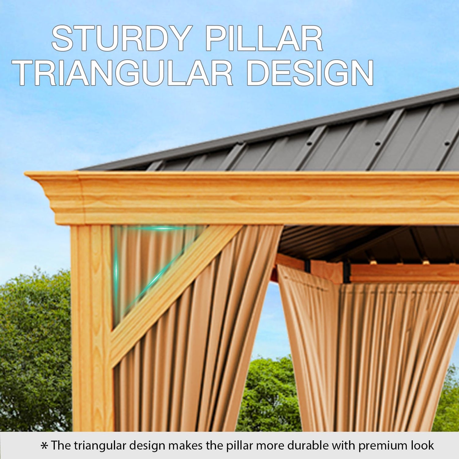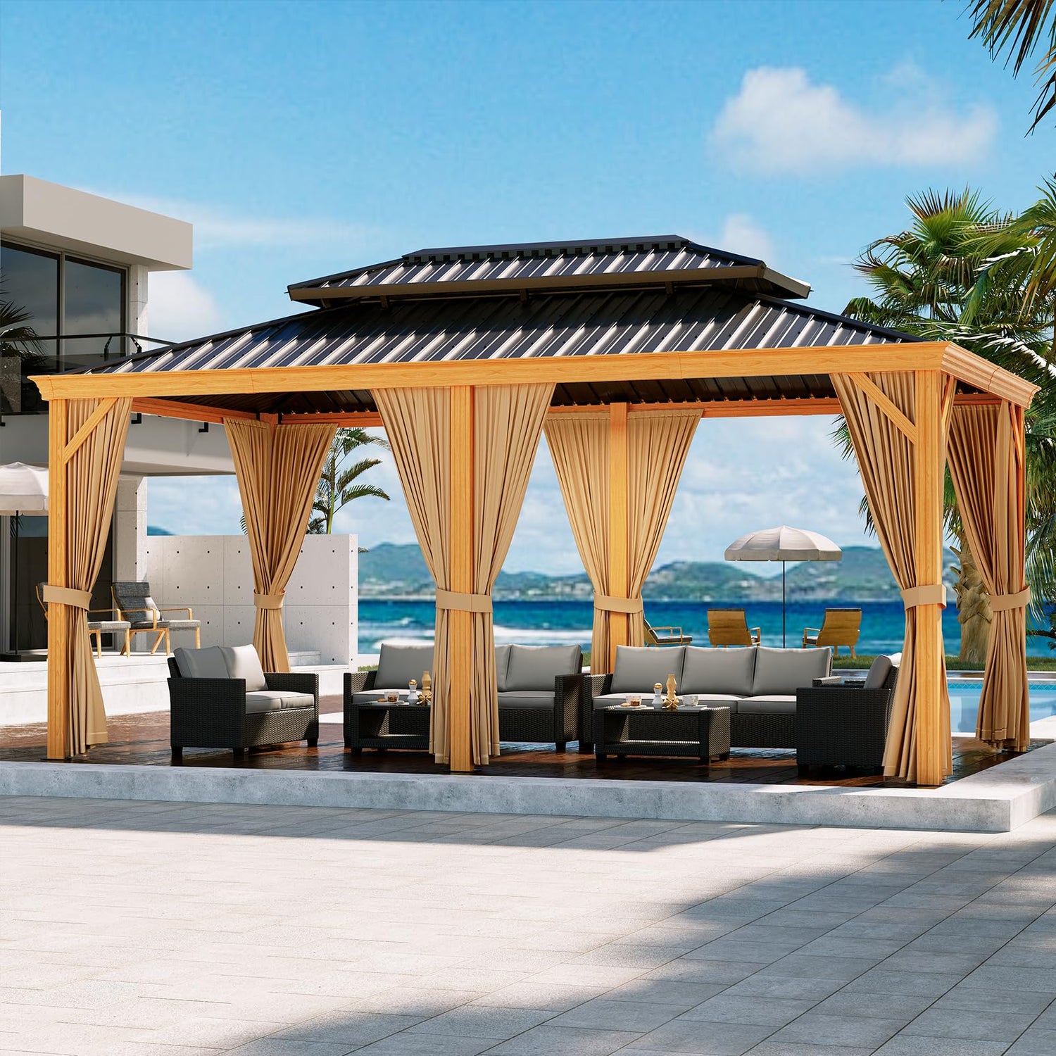 GAOMON 12x20ft Gazebo, Hardtop Outdoor Metal Roof Sun Shade Tent with Netting and Curtains, Permanent Wood Grain Galvanized Iron Aluminum Frame Garden Canopy for Patio, Backyard, Deck, Lawns