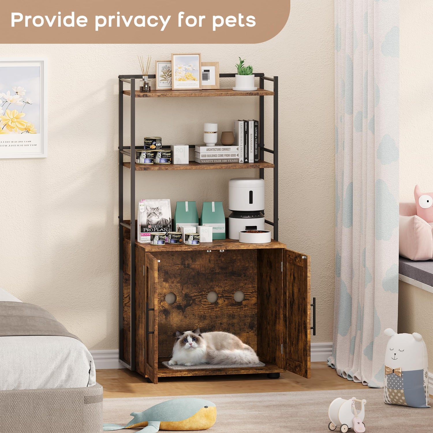 - 【Cat Litter Box Enclosure】:Featuring a two-in-one functional design of a cat cabinet and storage bookshelf, this litter enclosure shelf helps you say goodbye to mess and odor, while providing more space to store cat food, toys, and other pet supplies. Creates a comfortable and secure cat corner for your pet