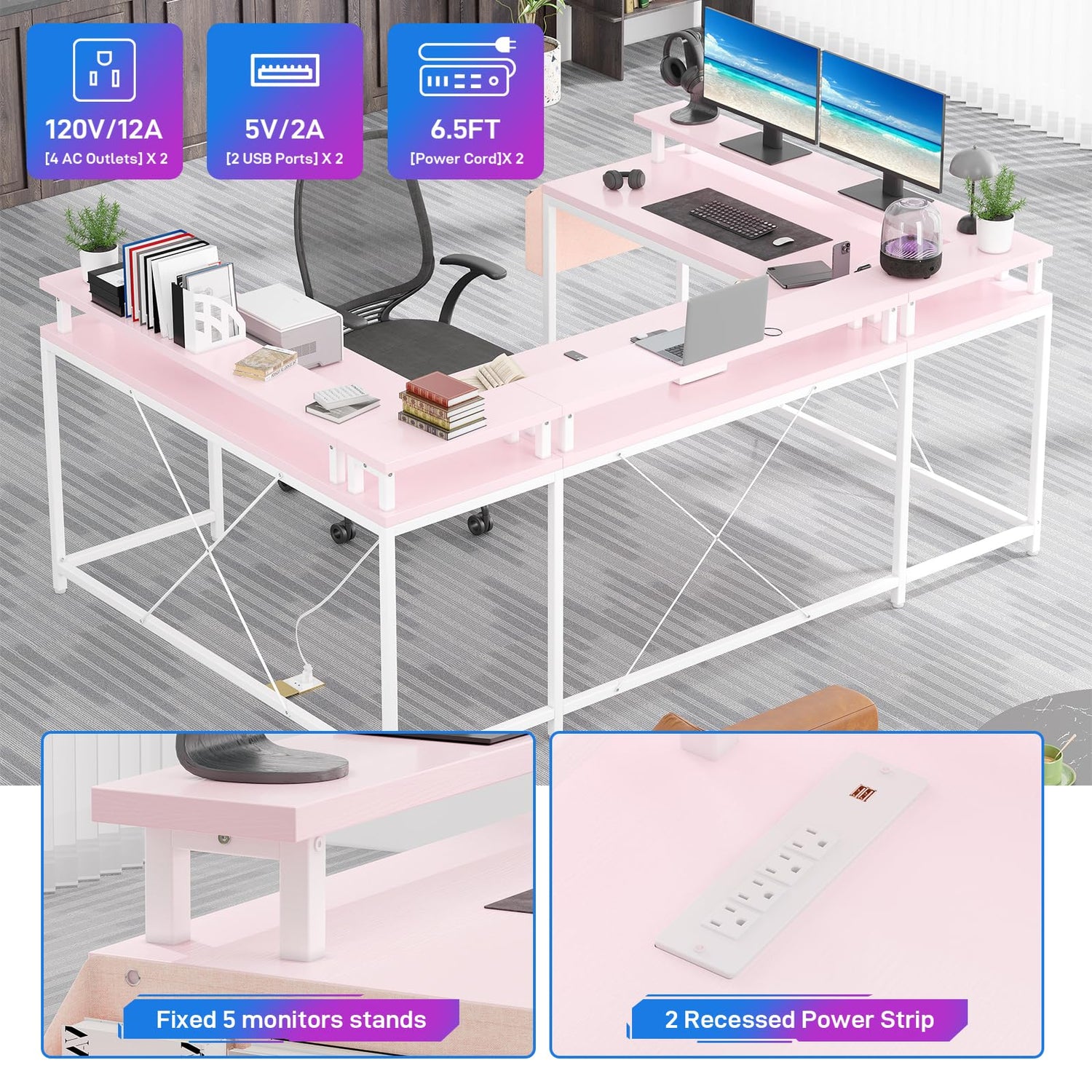 Details: GAOMON U Shaped Desk, 126 Inch Gaming Desk with Monitor Stand and LED Lights, Reversible Shaped Large Computer Desk with Power Outlets, Office Desk with Storage Bag and Hooks, Pink