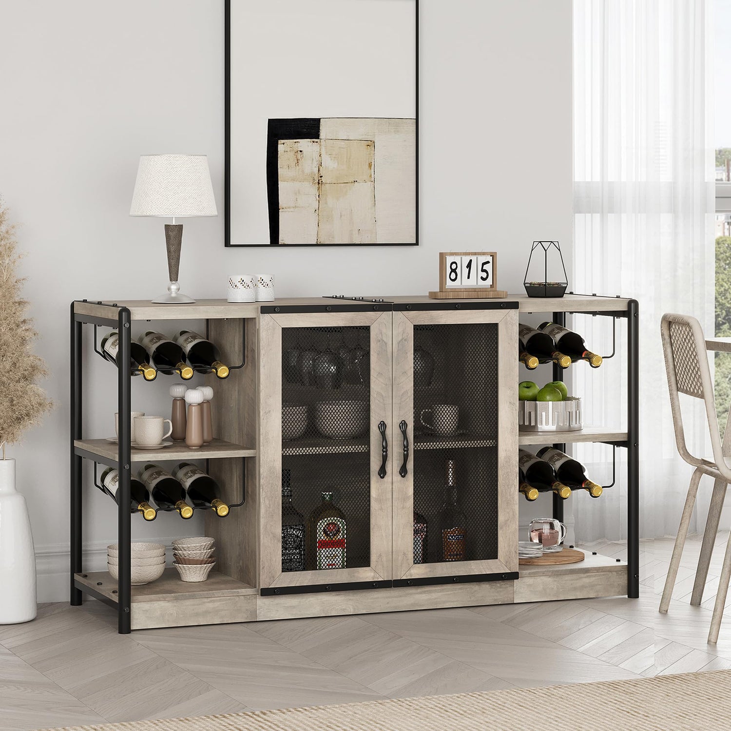 - LARGE STORAGE SPACE: The industrial liquor cabinet overall size is 55” L x 16” W x 31.1” H. The clean-lined and scientific and rational layout ensures ample storage space. The wine racks on the sides of the bar cabinet can hold 12 bottles of wine, and a wine glass rack in the middle can hang 12 wine glasses. The farmhouse wine bar cabinets in the middle can accommodate more irregular bottles of wine, liquor mixers and cups. This wine cabinet is also the perfect size to be used as a coffee bar.