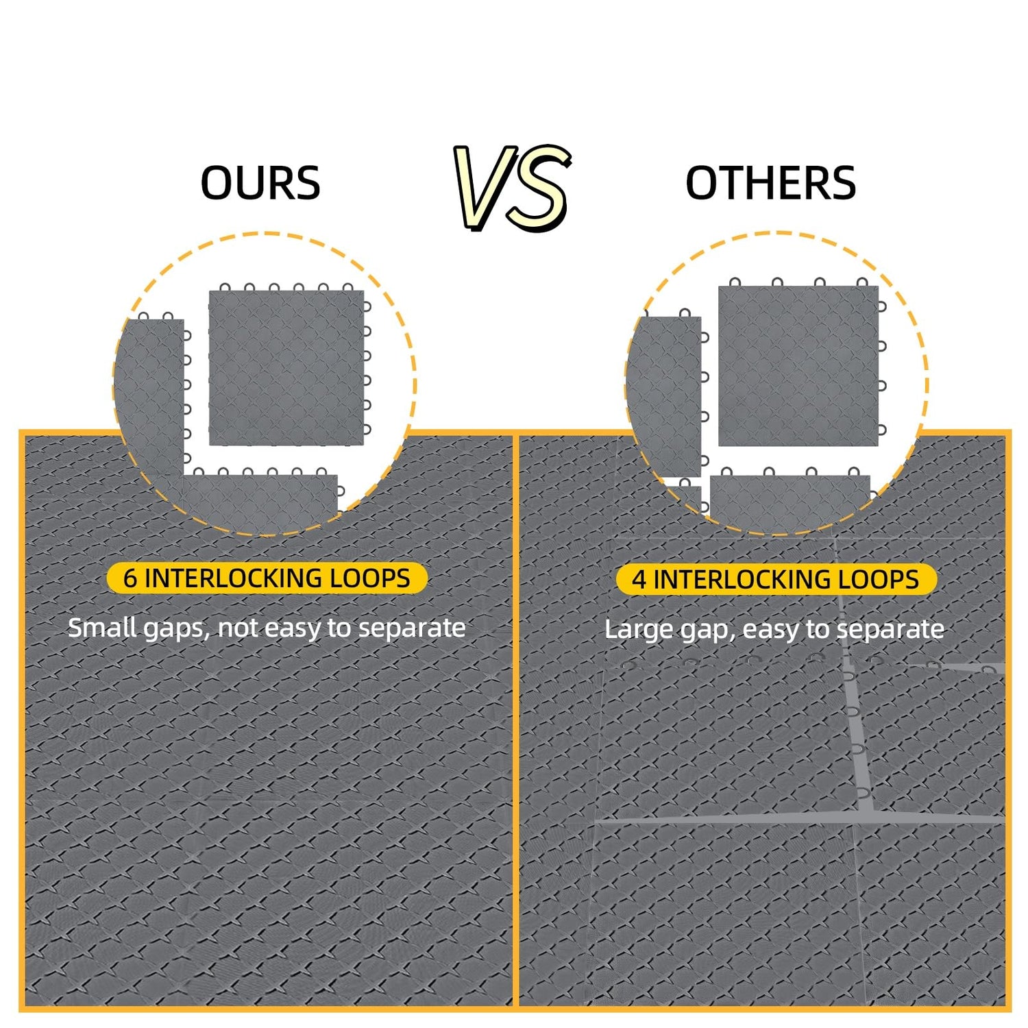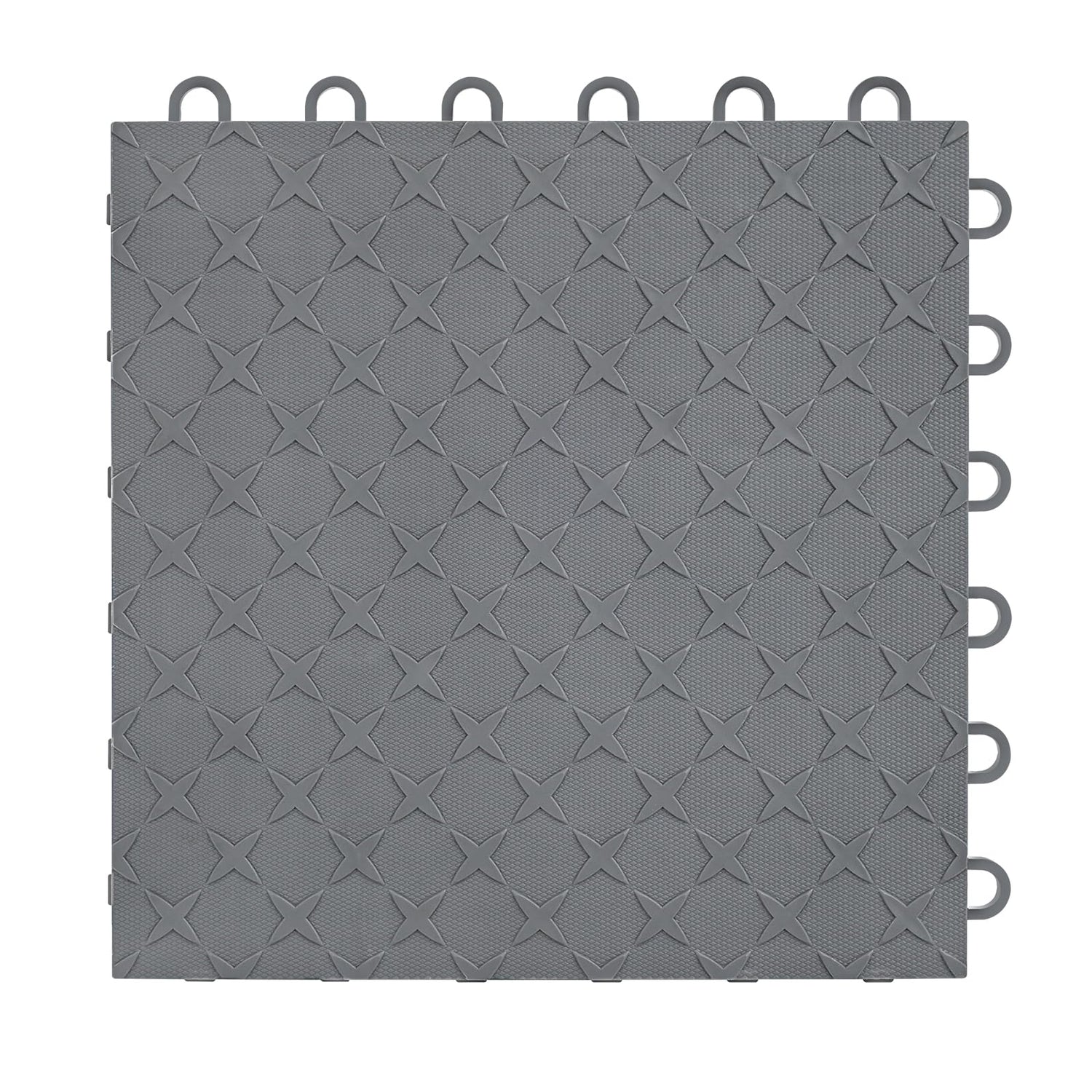 - INTERLOCKING FLOOR TILE DESIGN: Interlocking garage floor tiles are designed with six interlocking clasps that keep the tiles tightly interlocked and will not move;easy to assemble or disassemble. Clean the floor surface and snap the tiles together - no tools or glue required.