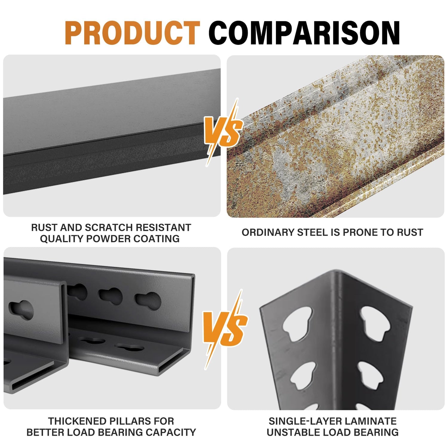 - 3.【RUST-PROOF AND EASY TO CLEAN】: The surface of this heavy duty metal garage shelving is coated with high quality, high density powder coating, which is not only beautiful, but the smooth, rust-proof and moisture-proof surface is less prone to rust and wear and tear. It is more durable and easy to clean compared to wood shelves that are prone to moisture and traditional painted shelves that are prone to rust. If you are looking for a heavy duty shelving for use in your garage and basement, it will be your best choice.