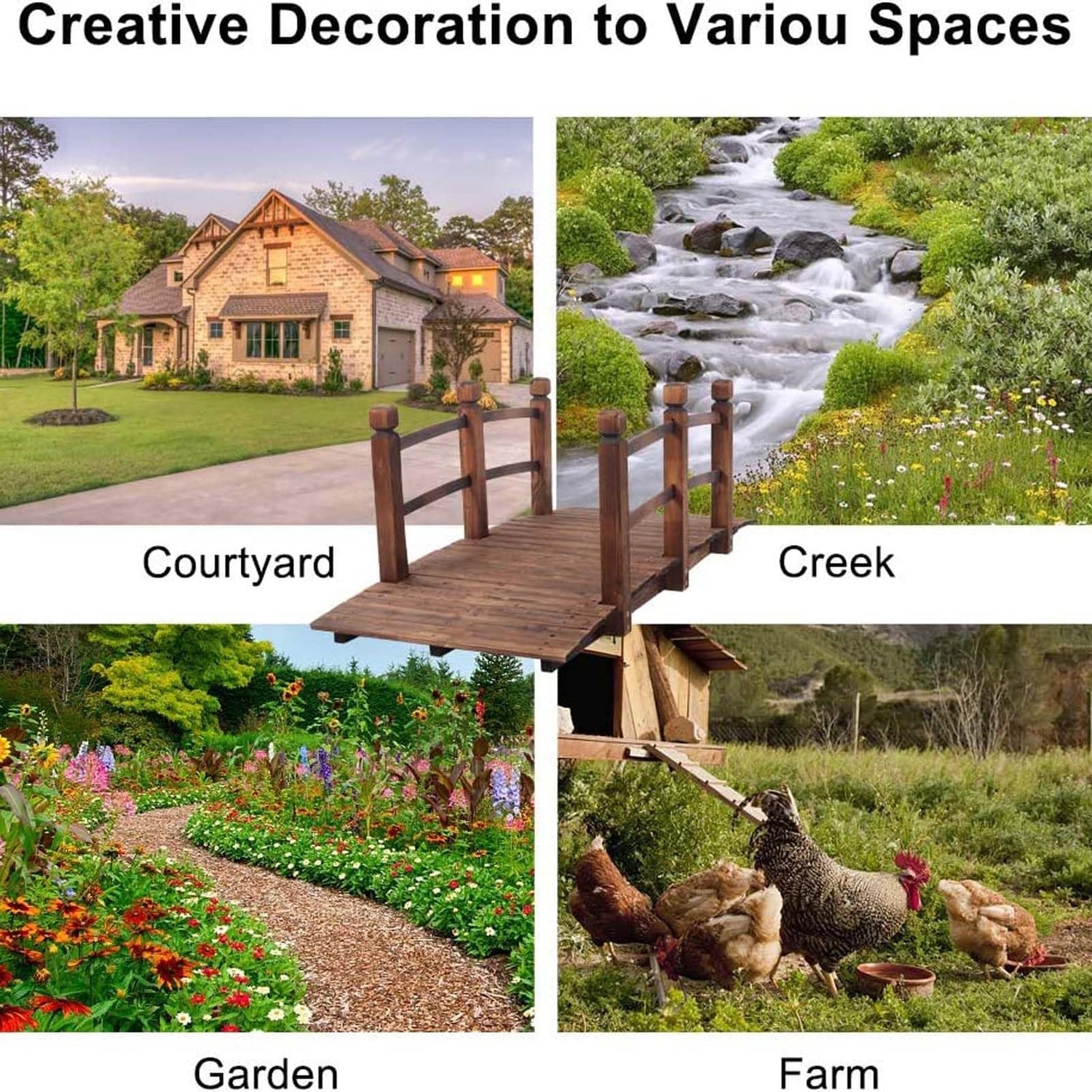 - 〖Multifunctional Outdoor Garden Bridge〗 Our decorative garden bridges are perfect for outdoor usage. Garden bridges 5ft allows you to shuttle through flowers, and streams, creating a unique passage. It can also be placed on top of the fish pond and fed to small fish.