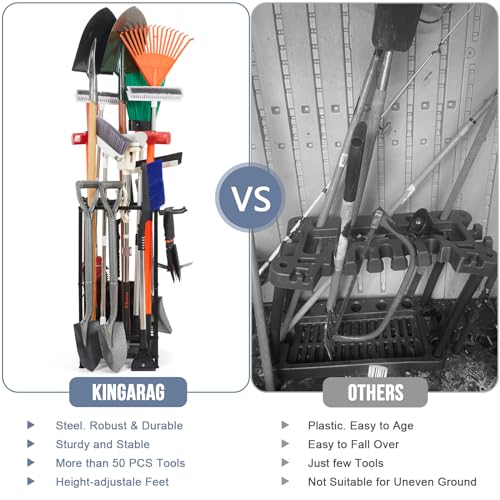 - Multifunctional Garden Tool Organizer: Garden tool storage can organizes up to 50 garden tools, including yard tools, farm tools, lawn tools, and cleaning equipment etc. Provide large capacity in a compact size. It simplifies tool storage and organization. Height-adjustable feet suitable for uneven ground. Suitable for garage, garden, shed, outdoors and backyards