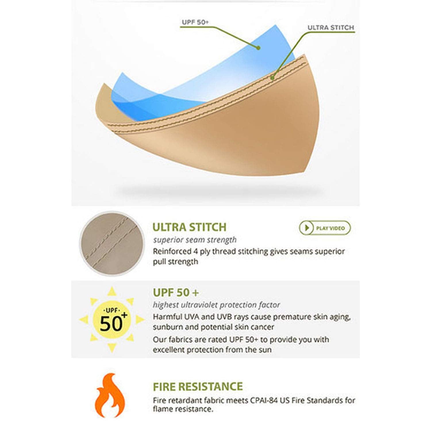 - UPF 50+, water resistant, CPAI-84 fire retardant