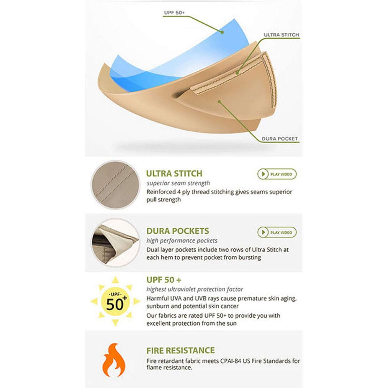 - Grommet rings installed on big canopy for water drainage. UPF 50+, water resistant, CPAI-84 fire retardant