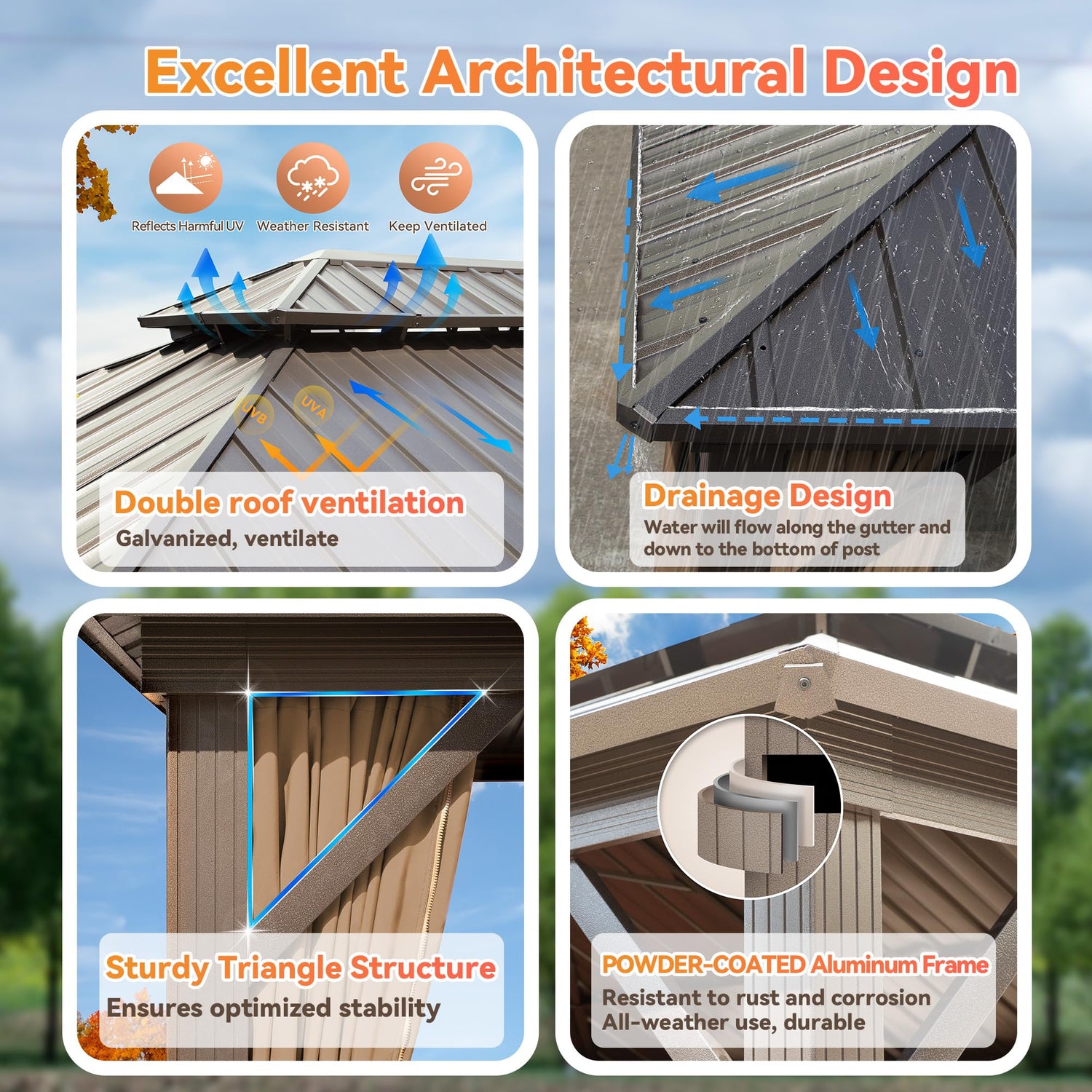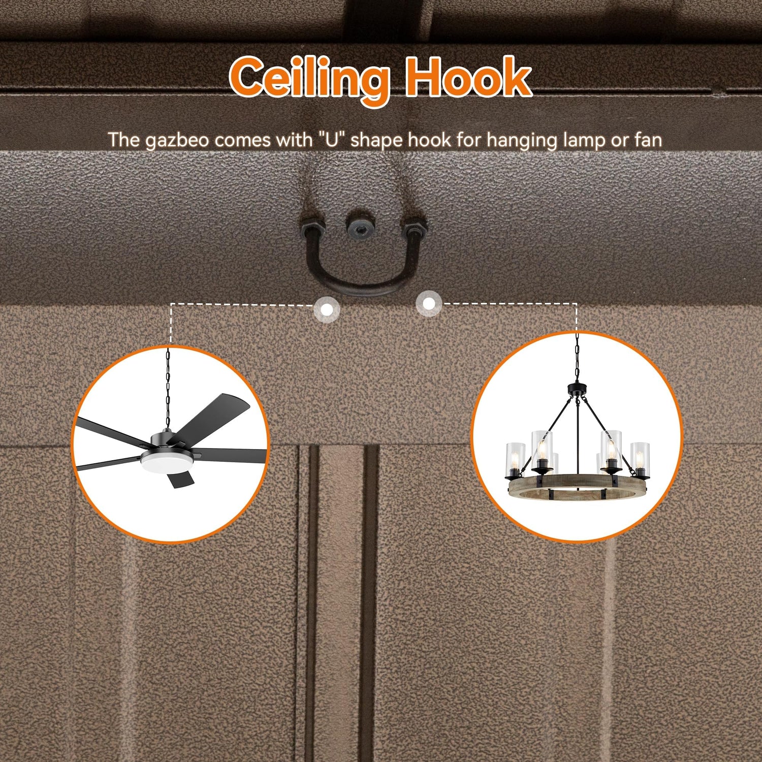 - 【Double Vent Roof and Central Hook】The galvanized double vent roof, designed for all-weather resistance and UV reflection, also space between two roofs ensure airflow, keeping the gazebo ventilated. Also a central hook for hanging lights or fans offers a comfortable and adaptable outdoor space for various activities.