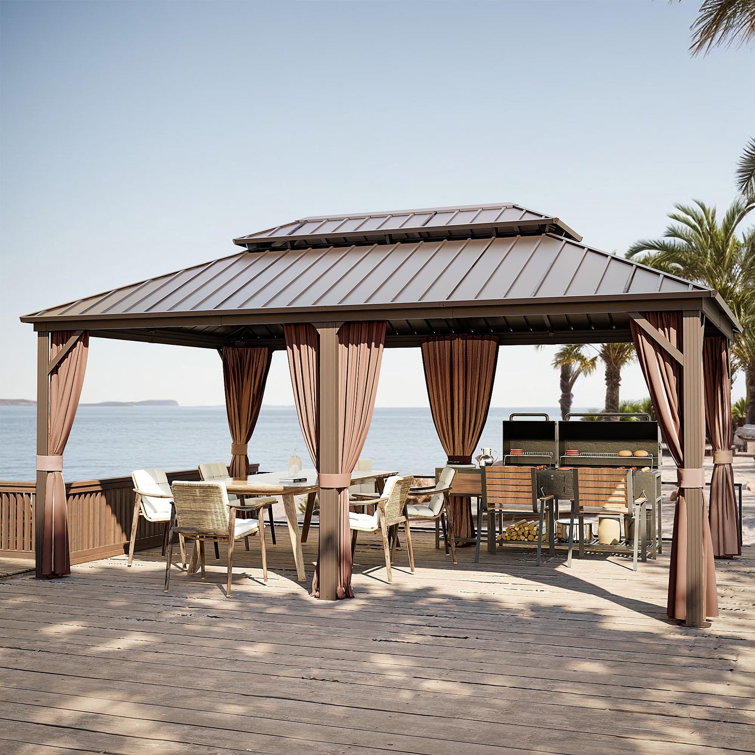 Gardenbee 12x18 ft Gazebo Double Roof Canopy with Netting and Curtains, Outdoor Gazebo 2-Tier Hardtop Galvanized Aluminum Frame Garden Tent for Patio, Backyard, Deck and Lawns