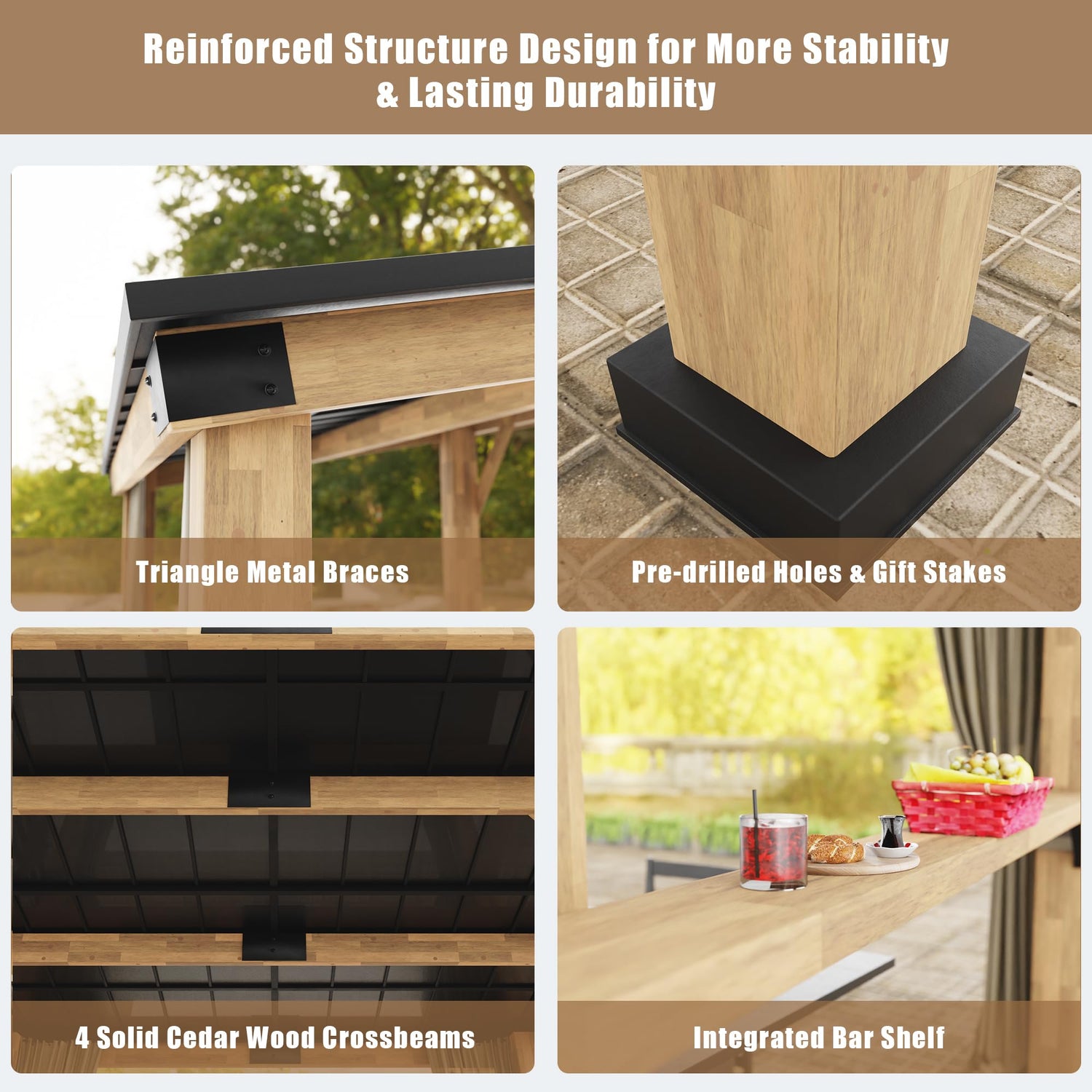 Gardenbee Cedar Wood Gazebo 10 x 12 ft. - Patio Wood Gazebo with Cedar Frame and Metal Steel Roof Panels, Hardtop Gazebo for Patio Lawn Deck and Parties