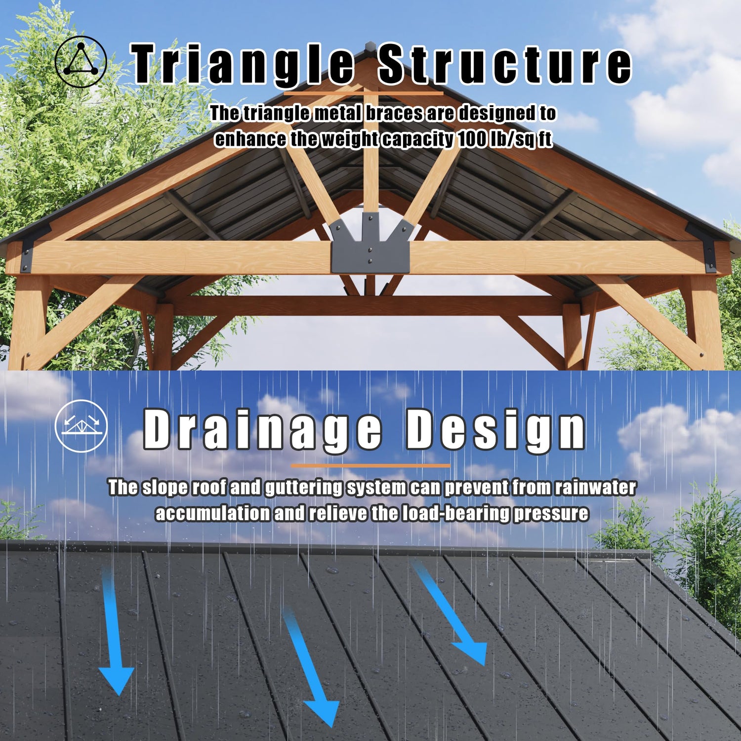 - Sloped Gable Top - This Hardtop Gazebo is designed with a slope design top which can effectively help with drainage and avoid raindrops to accumulate. The sturdy roof panel is waterproof and can withstand wind up to 80MPH.