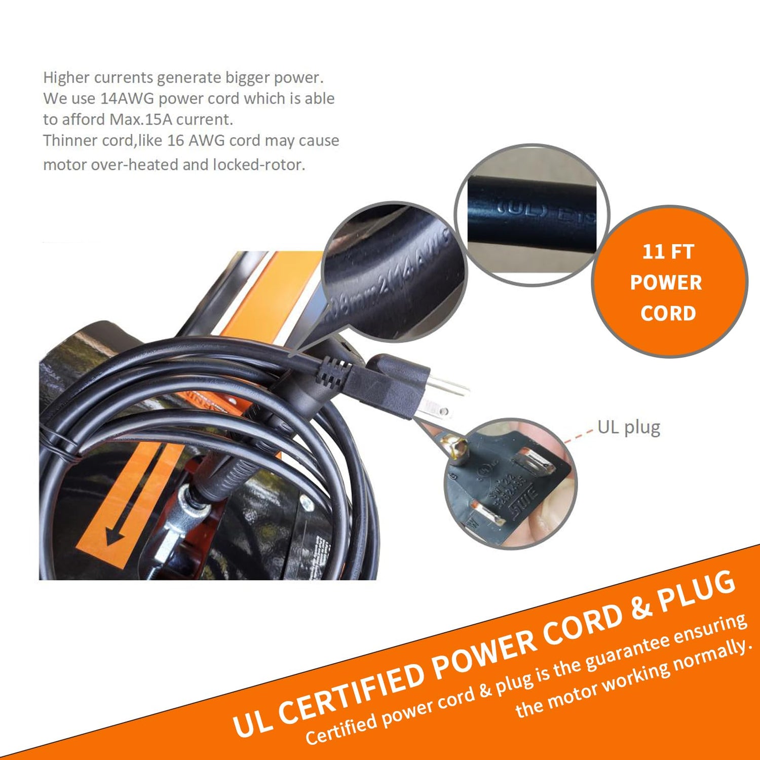 - 【Safe & Reliability】 The motor,power cord and plug are UL certified and produced in copper wire, 14AWG power supplying cord withstanding Max.15Amps current. The length of power cord is 11 feet.