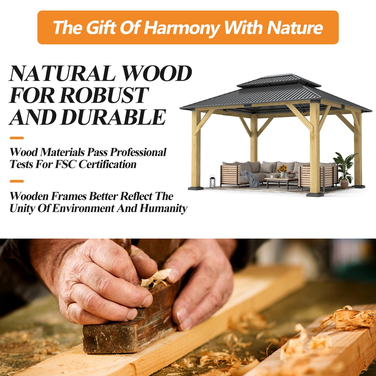 - ⛱️PREMIUM QUALITY WOOD FRAME: Our wooden gazebos are constructed with high quality wood frames that are FSC certified to ensure the patio vented roof gazebo durability and stability. Made of sturdy wood that is durable and long-lasting, providing you with a long-lasting outdoor deck wood gazebo. Besides, we maintain the ecological balance and biodiversity of our forests by complying with FSC standards. And promoting ecologically sustainable development in making this wood frame gazebo.