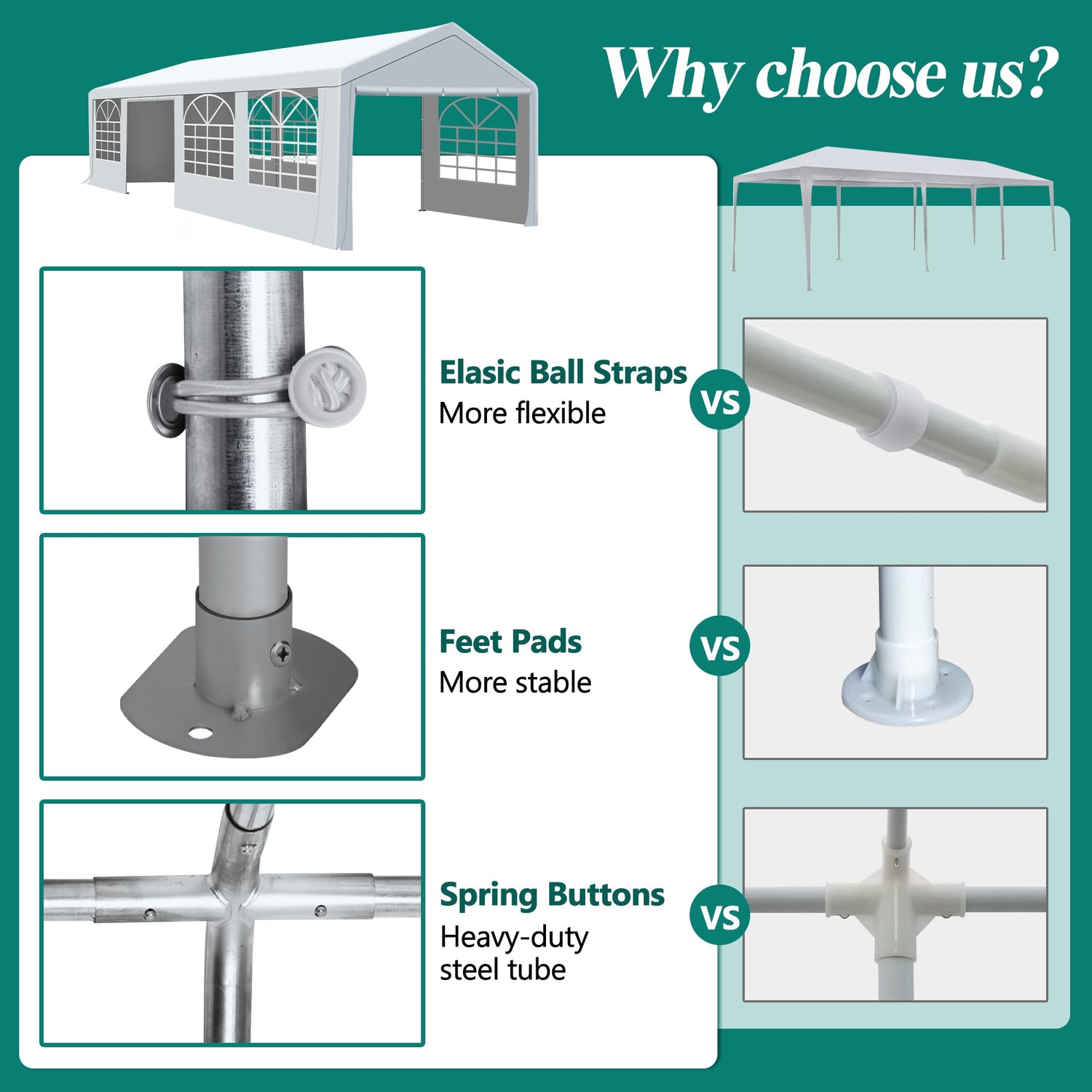 - 🏕️MORE STABLE DESIGN: Our canopy wedding tent includes Strong Grip, Strong Rope and Sand Bags to ensure the stability of the party tent. The metal stakes ensure that the tent to the groung deeply