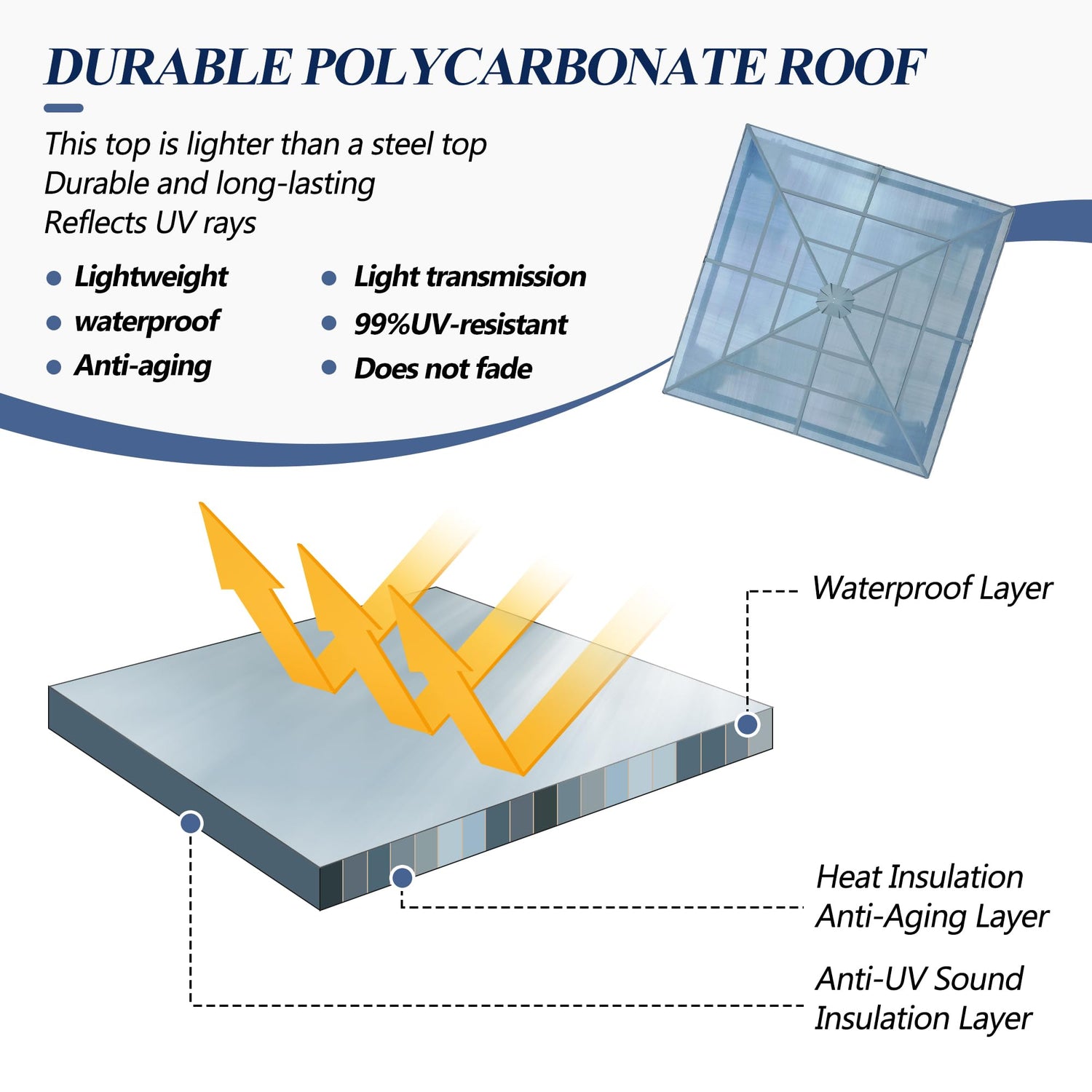 - ⛱️DURABLE AND WEATHER RESISTAIN: Our Patio Hardtop Gazebo is constructed with a sturdy steel frame to ensure long-lasting durability and stability. The polycarbonate top of outdoor gazebo provides reliable protection against rain, snow, and UV rays, allowing you to enjoy outdoor activities all year round. (Please note that the polycarbonate roof can only block UV rays, not high temperatures and strong light)