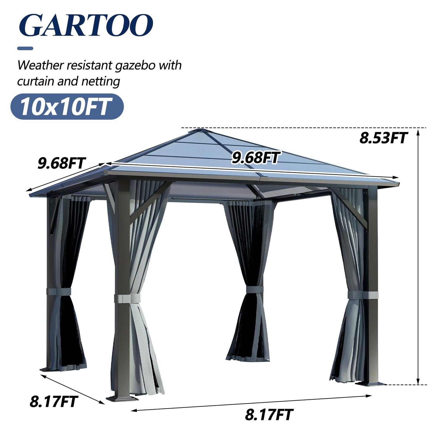 GARTOO 10’x10’ Patio Hardtop Gazebo with Polycarbonate Roof, Waterproof Outdoor Canopy Gazebo, Steel Frame Permanent Pavilion with Curtains and Netting, Perfect for Backyard, Patio, Lawn, Garden