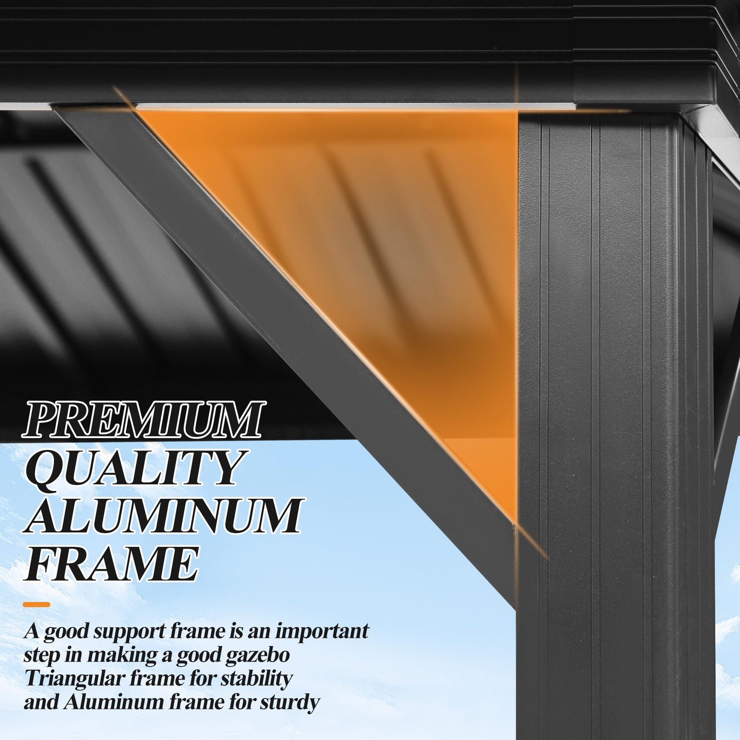 - ⛱️STURDY ALUMINUM FRAME: GARTOO Hardtop Gazebo is made of premium powder-coated aluminum & iron, providing strong support fade, rust, and corrosion. Our Vented hardtop Gazebo has reinforced triangular frame on each poles, which provide extra support making the gazebo more stable. The feet contain holes and ground stakes for additional stability, 4 reinforced corners provide extra durability and safety; easy assembly