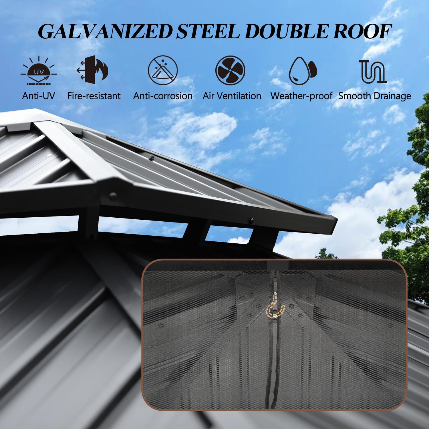 - ⛱️DOUBLE VENTED GALVANIZED IRON TOP: Outdoor gazebo has ventilated double tops provide safety from harmful UV rays while the unique design allows wind to pass through. The Vented Roof is made of galvanized iron, which can greatly protect from rainwater and anti-corrosion. Hardtop gazebos for patios can tolerate high summer temperatures and withstand UV rays,provides you plenty of cool shade to enjoyment