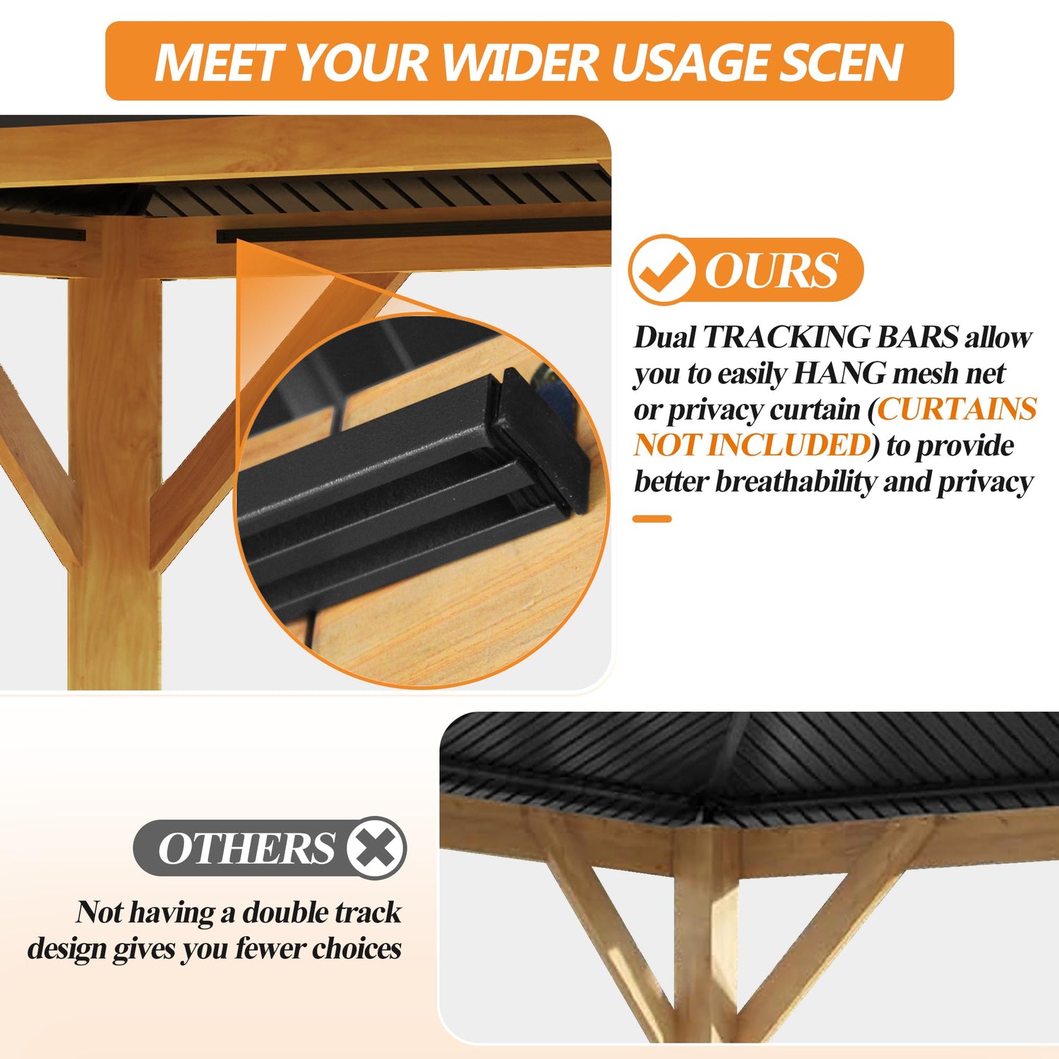 - ⛱️VENTED DOUBLE-TOP DESIGN: Our metal top wooden gazebos feature a double-top design that allows for optimal air circulation to keep you cool and comfortable on hot summer days. On rainy days, double-topped vertical stripes for easy rainwater run-off, and the metal hardtop gazebo effective system also helps to relieve pressure on the galvanized steel gazebo top, ensuring a safe and secure outdoor space.