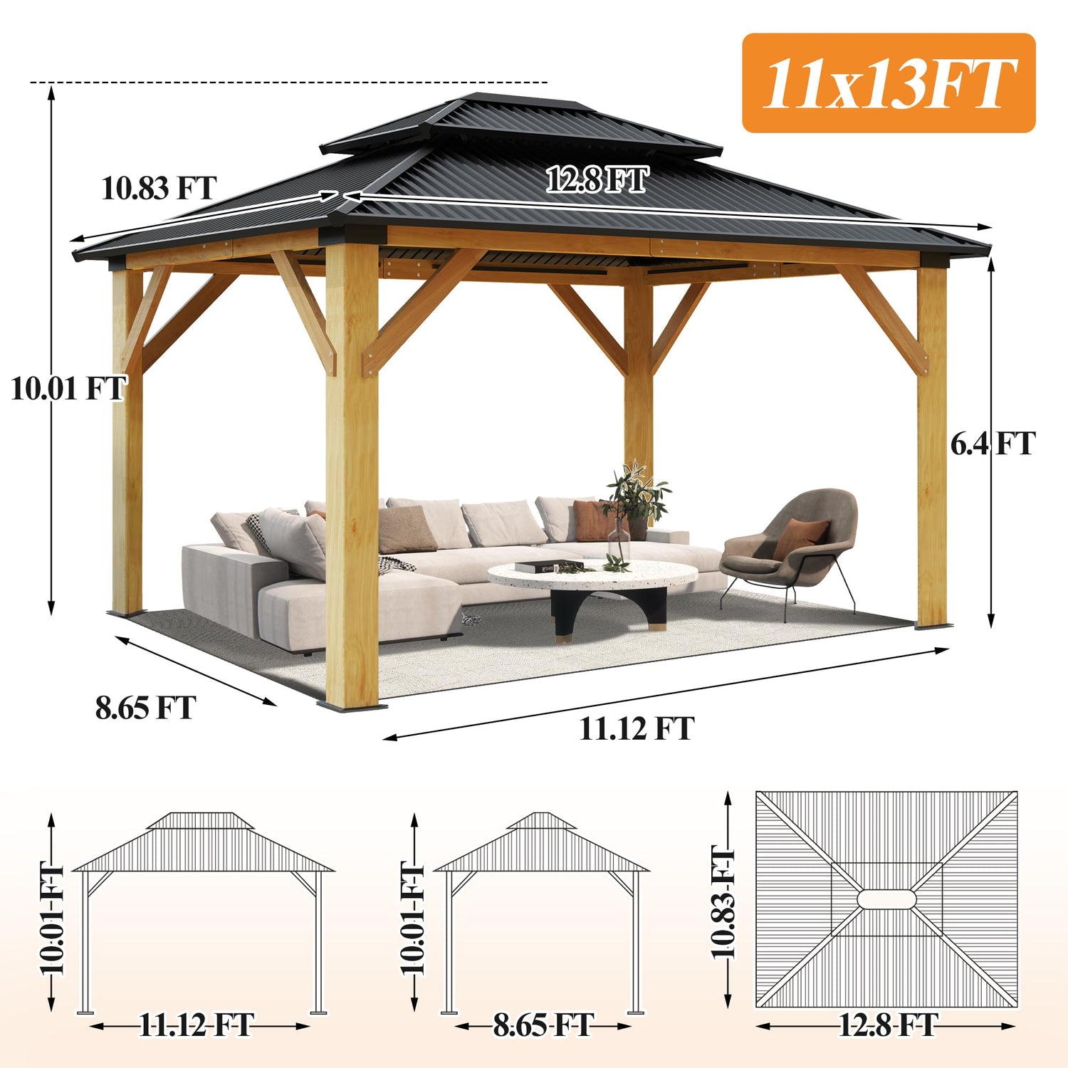 GARTOO 11’x13’ Outdoor Wooden Gazebo - Patio Galvanized Steel Gazebo with Double Vented Roof, Heavy-Duty Cedar Wooden Gazebo for Garden, Lawn, Poolside, Backyard Deck