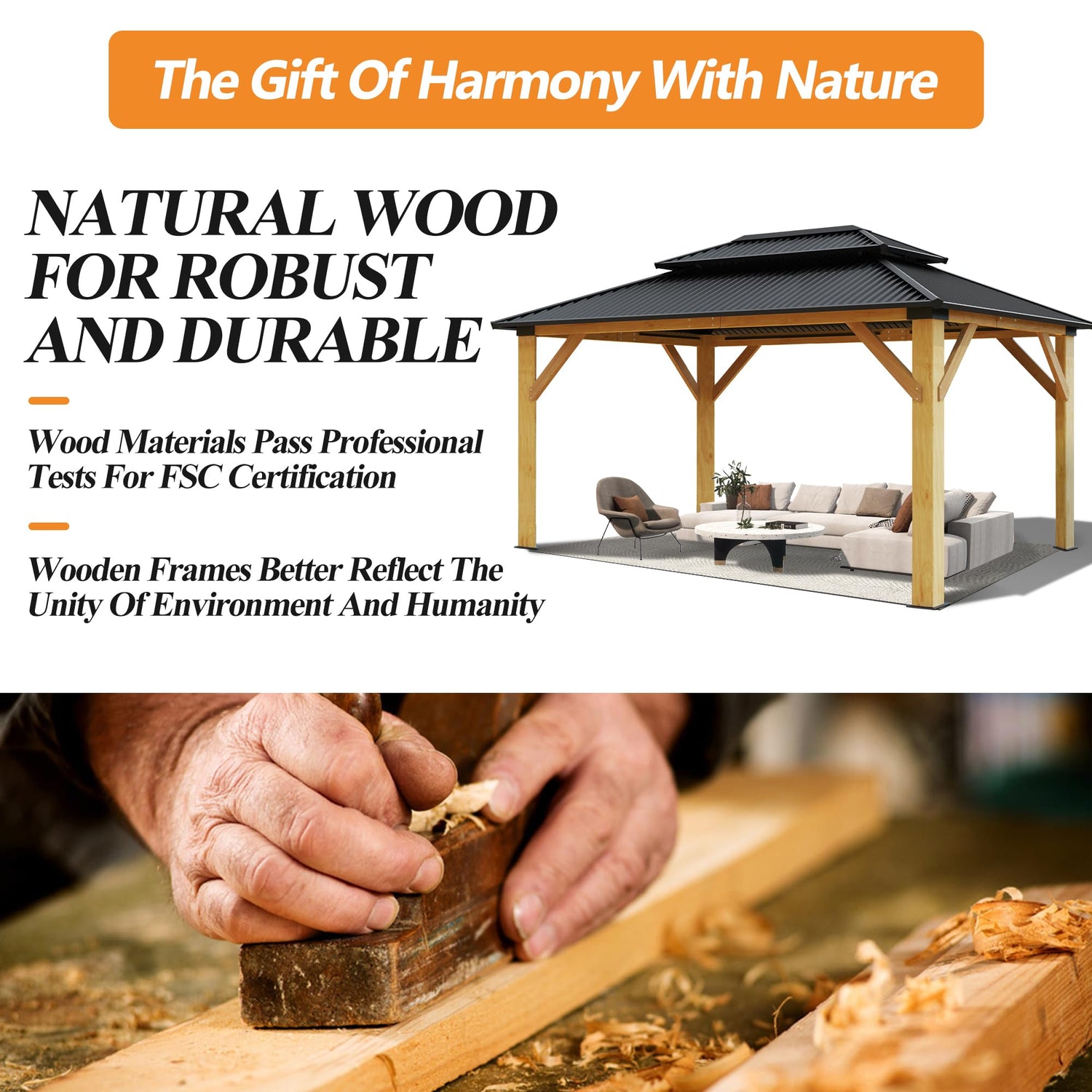 - ⛱️PREMIUM QUALITY WOOD FRAME: Our wooden gazebos are constructed with high quality wood frames that are FSC certified to ensure the patio vented roof gazebo durability and stability. Made of sturdy wood that is durable and long-lasting, providing you with a long-lasting outdoor deck wood gazebo. Besides, we maintain the ecological balance and biodiversity of our forests by complying with FSC standards. And promoting ecologically sustainable development in making this wood frame gazebo.