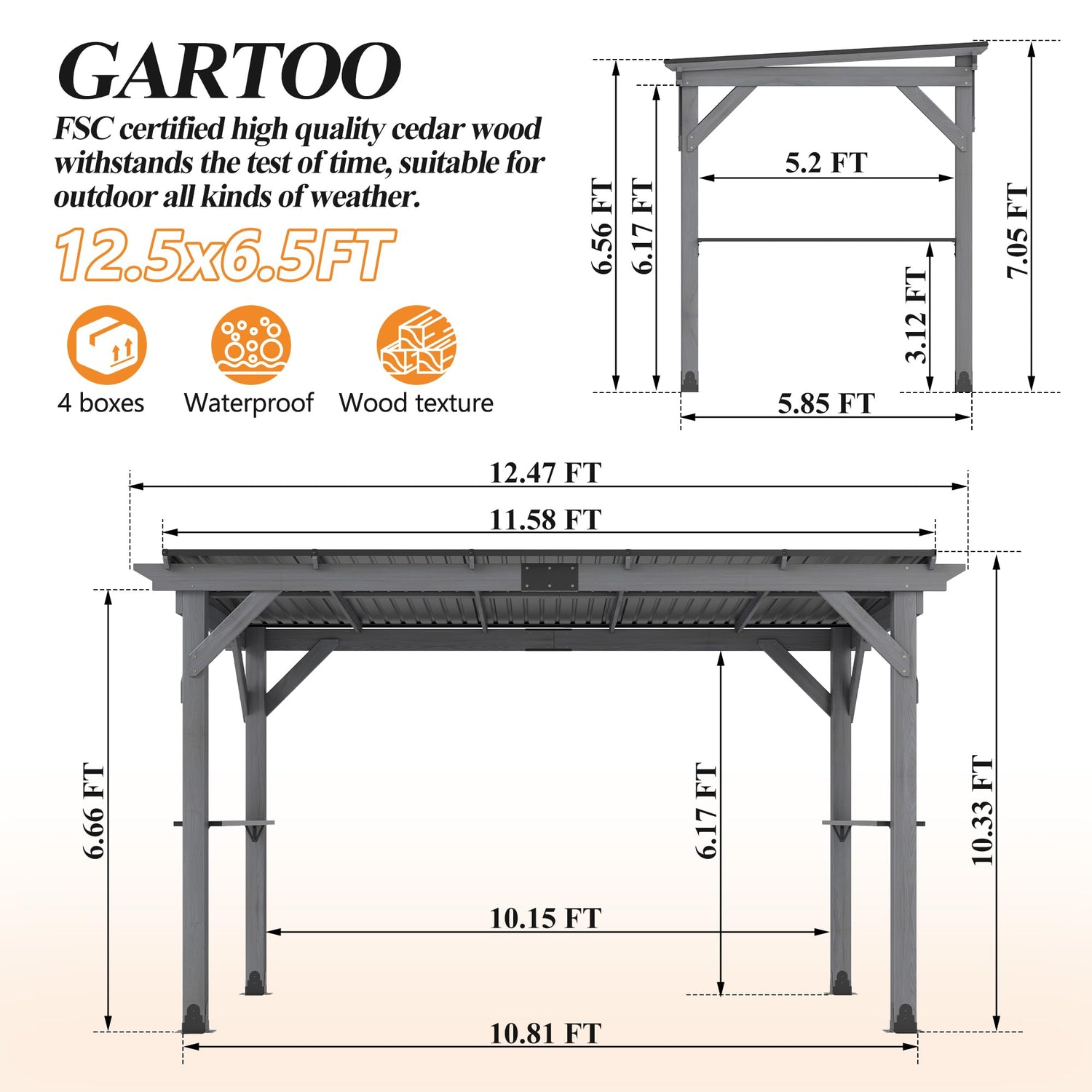GARTOO 12.5'x6.5' Outdoor Grill Gazebo - Hardtop Cedar Wood Gazebo with 2 Side Shelves and Galvanized Steel Roof, Patio Wooden BBQ Pergola for Garden, Porch and Backyard