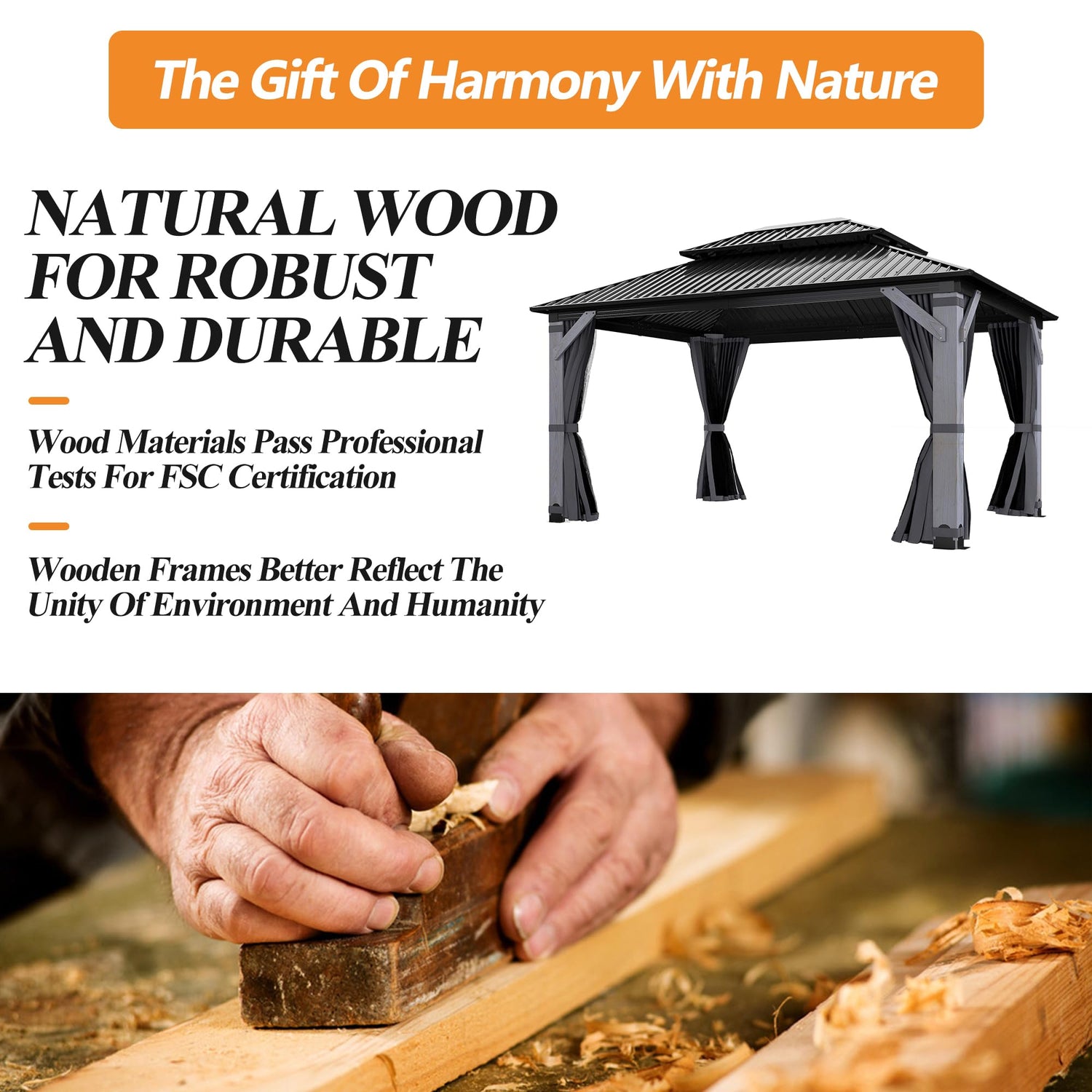 - ⛱️PREMIUM QUALITY WOOD FRAME: Our wooden gazebos are constructed with high quality wood frames that are FSC certified to ensure the patio vented roof gazebo durability and stability. Made of sturdy wood that is durable and long-lasting, providing you with a long-lasting outdoor deck wood gazebo. Besides, we maintain the ecological balance and biodiversity of our forests by complying with FSC standards. And promoting ecologically sustainable development in making this wood frame gazebo