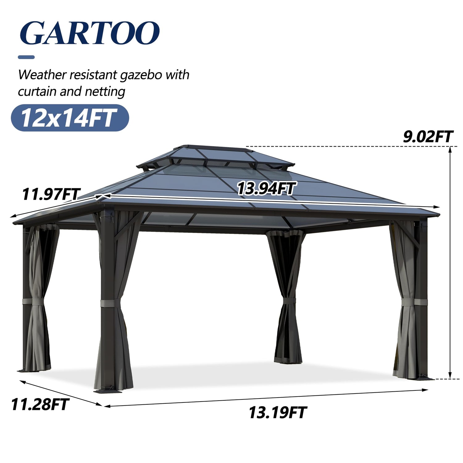 GARTOO 12x14FT Polycarbonate Hardtop Gazebo with Double Roof - Heavy-Duty Steel Frame Gazebo with Breathable Netting & Privacy Curtain for Patio, Porch, Garden, Lawn, Deck, Backyard