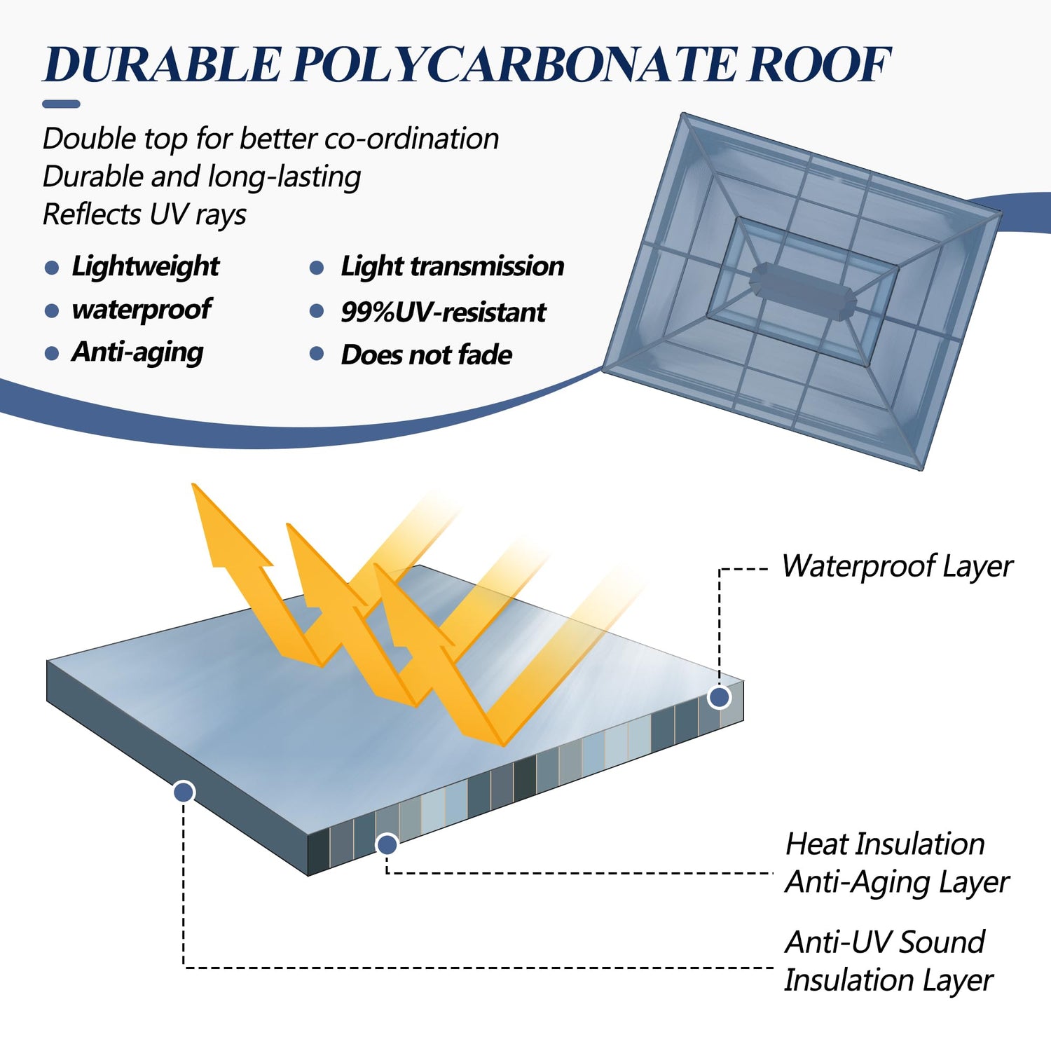 - ⛱️DURABLE AND WEATHER RESISTAIN: Our Patio Hardtop Gazebo is constructed with a sturdy steel frame to ensure long-lasting durability and stability. The polycarbonate top of outdoor gazebo provides reliable protection against rain, snow, and UV rays, allowing you to enjoy outdoor activities all year round. (Please note that the polycarbonate roof can only block UV rays, not high temperatures and strong light)
