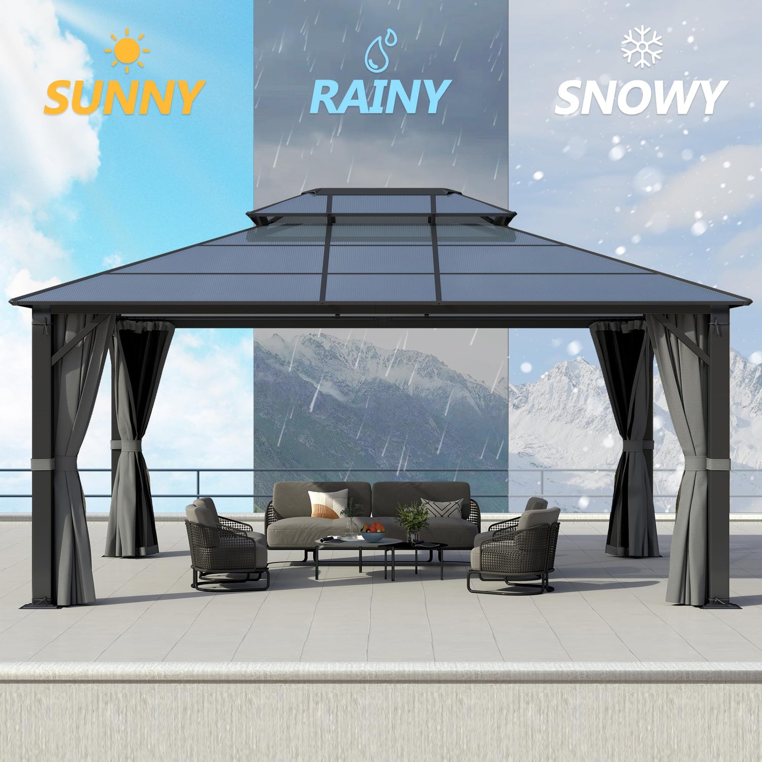 GARTOO 12x16FT Polycarbonate Hardtop Gazebo with Double Roof - Heavy-Duty Steel Frame Gazebo with Breathable Netting & Privacy Curtain for Patio, Porch, Garden, Lawn, Deck, Backyard