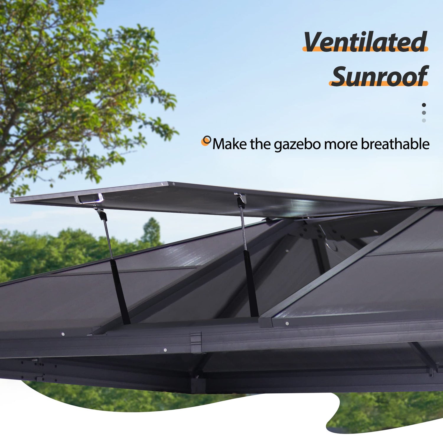 - Permanent polycarbonate top sunroof: Our gazebos feature a polycarbonate roof, which can filter out 99% UV rays and help keep the gazebo cooler. The reasonable roof slope design also allows water to flow out fast to prevent rainwater from massing. The gazebo has an extra sunroof that can open and close easily, keeping its ventilation and seeing the sky at night.