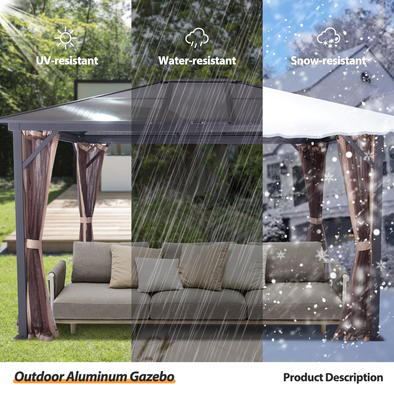 - Powder-coated aluminum frame: The outdoor gazebo is constructed with an anti-rust powder-coated aluminum frame, which provides sturdy & stable support for the gazebo. The heavy-duty powder-coated aluminum frame is resistant to rust, corrosion, and chipping during all seasons. Our polycarbonate hardtop gazebo can use long-lasting time since you purchase it.