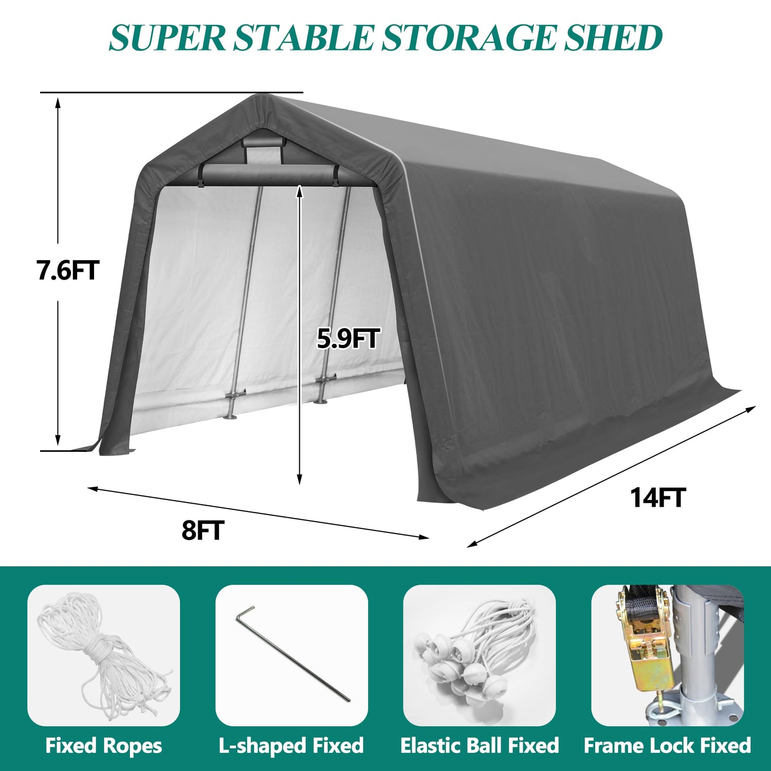 - 🧰STURDY STEEL FRAME: The outdoor storage shelter shed is made of a rust resistant heavy-duty steel frame. SIZE: 8FT*14FT*7.6FT. The outdoor portable garage storage shed can hold Bike, ATV, Motorcycle Shelter, garden tools, lawnmower, patio furniture storage and so on