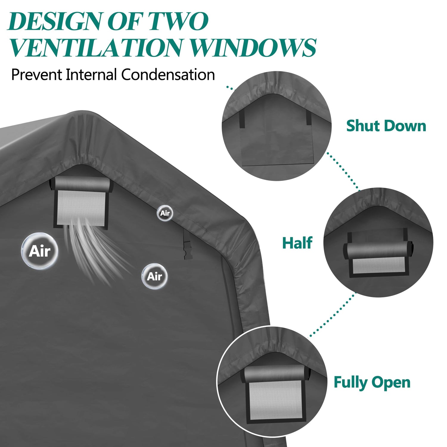 - 🧰170G WATERPROOF CANOPY COVER: Our Storage Shelter is made of waterproof 170g PE tarp with Roll-up Ventilation Windows. Heavy-duty Zipper Design