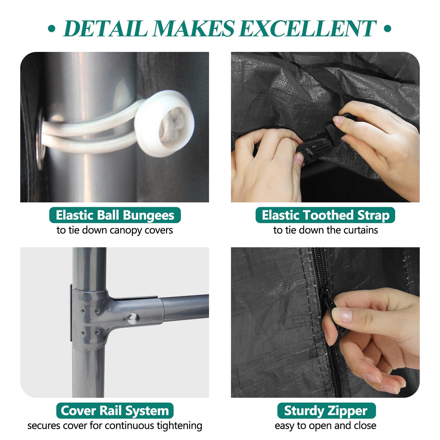 - ❗Please note that when a storm comes, the canopy should be stowed away to prevent it from blowing away. In winter, you will need to clear the snow from the tarp timely to prevent it from collapsing.