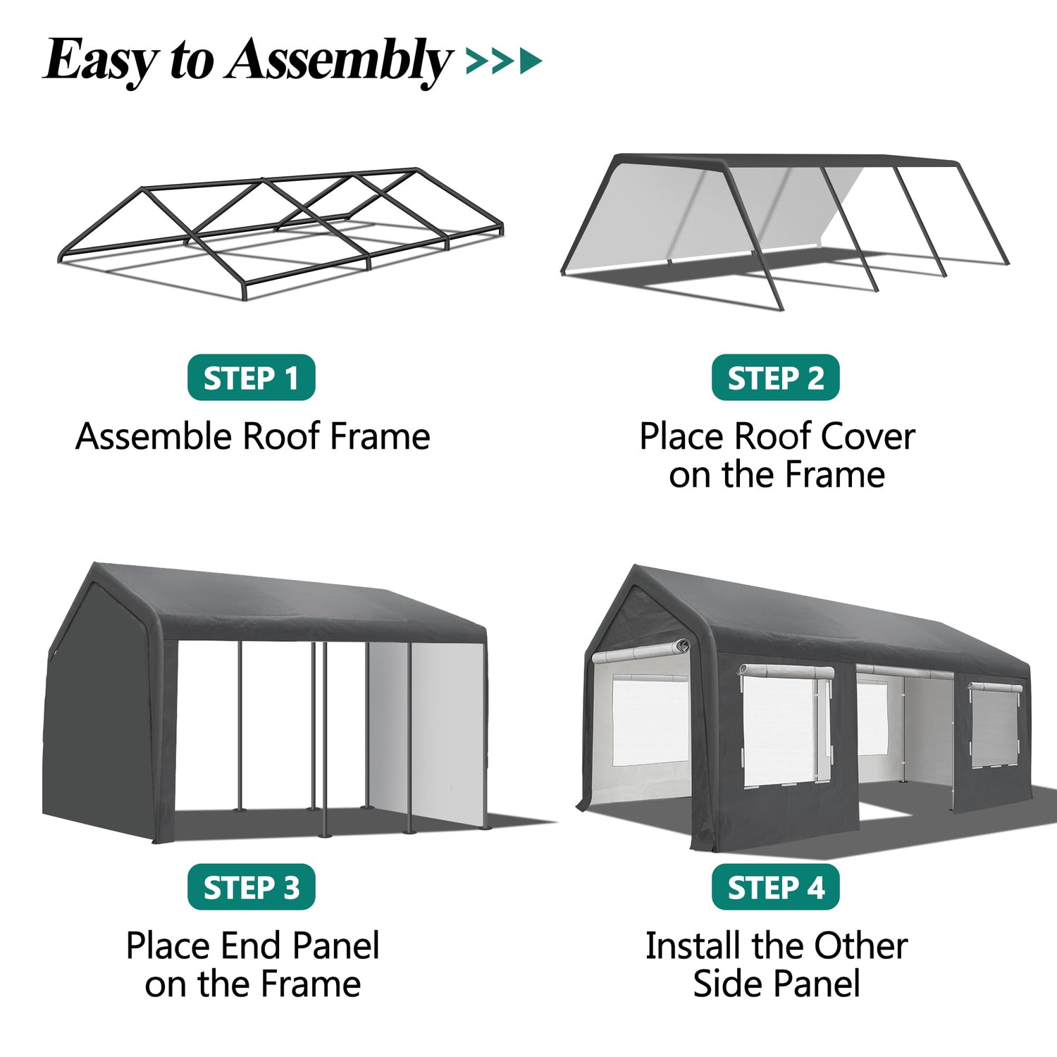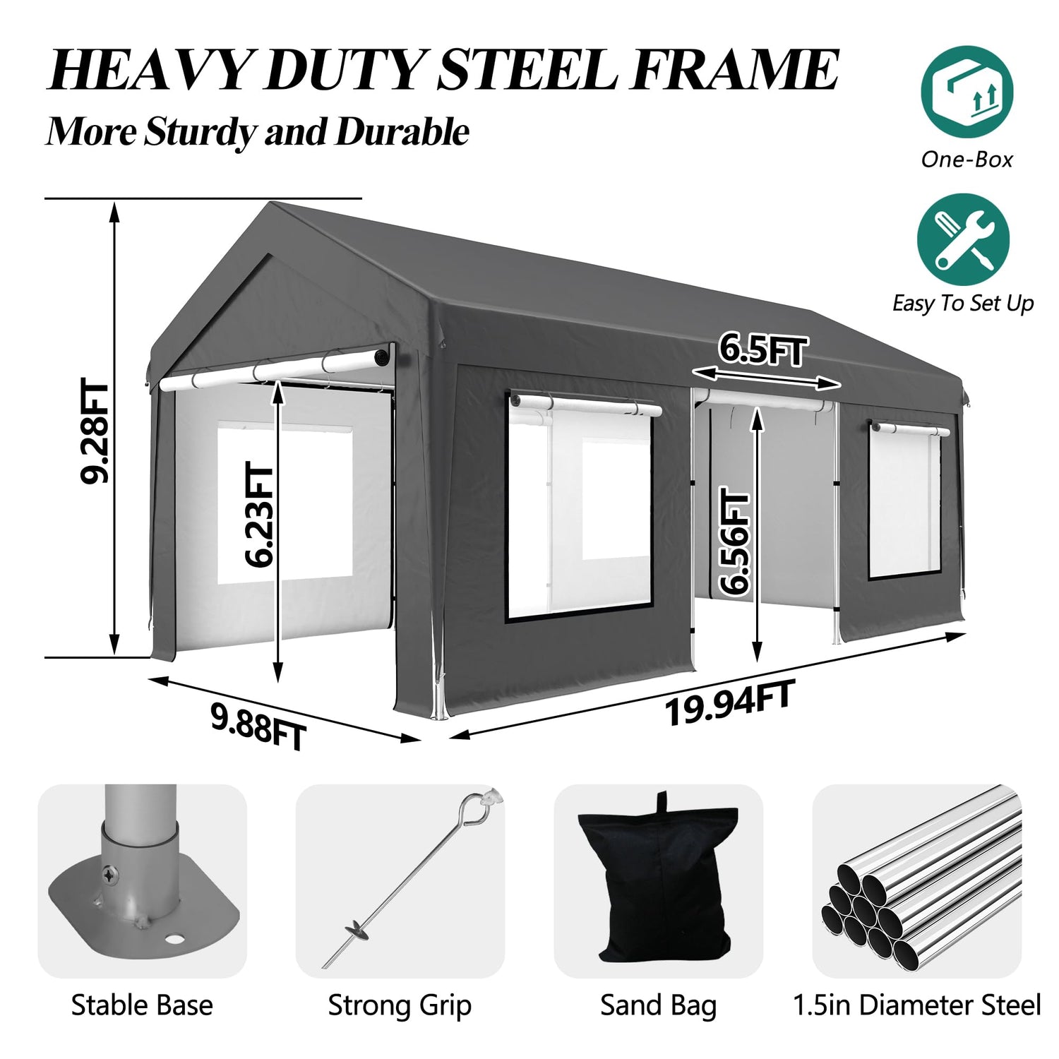 - 🚙170G WATERPROOF CANOPY COVER: Our large Carport is made of waterproof 170g PE tarp with Roll-up Ventilation Windows and 2 Side Doors Design. SIZE: 19.94FT*9.88FT*9.28FT. The outdoor carport storage can hold Car, Boat, Truck, Auto, Motorcycle and so on. It is also suitable for outdoor events like parties, weddings, commercial (Please do not use it when the wind is strong and Please clear the snow promptly)