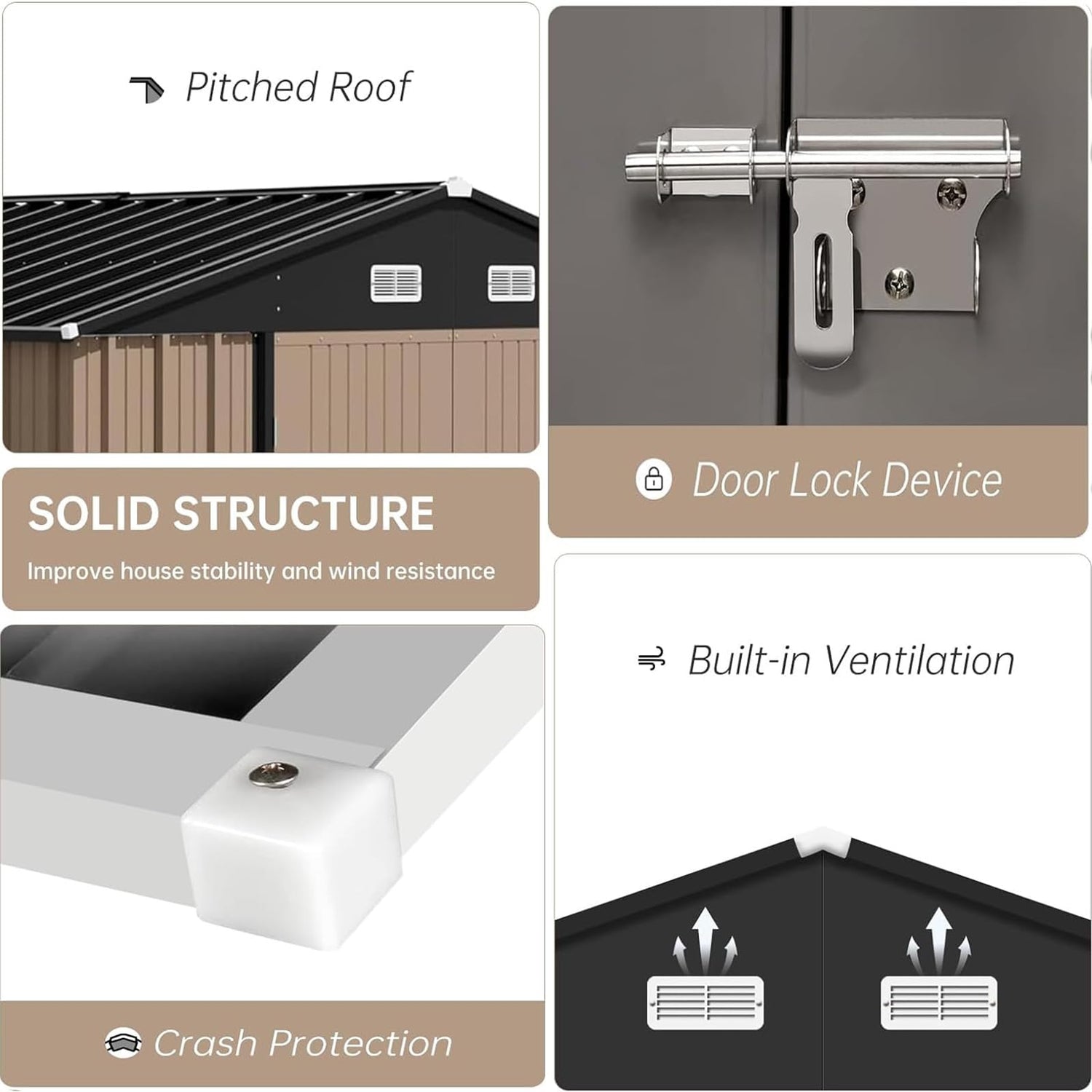 - 【Sturdy & Durable】: Made of high-quality galvanized steel with advanced corrosion resistance, this shed features two robust lockable doors (locks not included) to securely protect your belongings from unauthorized access and animals.