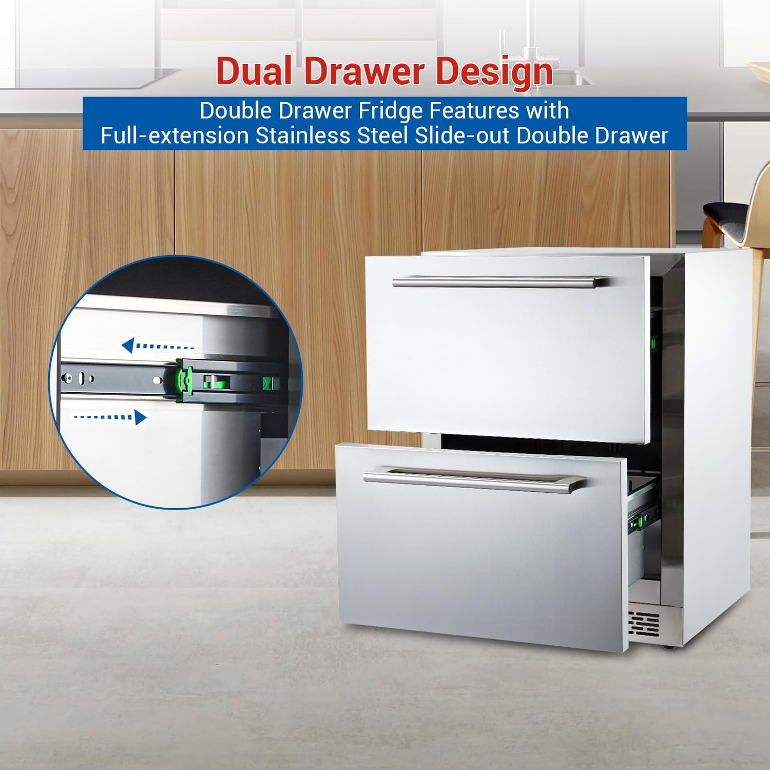 - đșăStainless Steel Slide-Out Double Drawer with DividerăThe Fridge drawer is equipped with a Double Drawer and fits more than the traditional side-by-side refrigerator It has a divider in the main Fridge section and also has a sliding Fridge drawer to separate foods to help you better plan the internal space of the refrigerator.