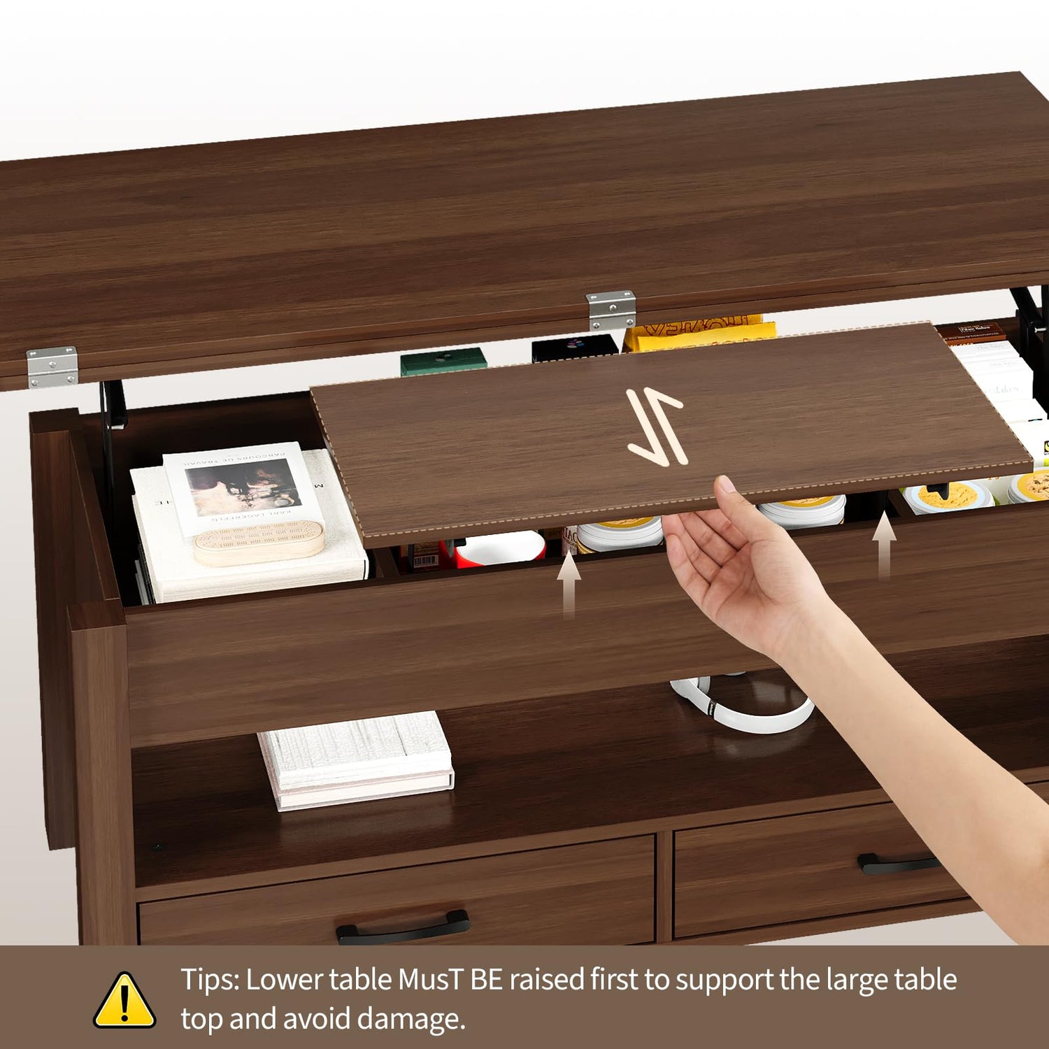 - 【Sturdy and Durable Structure】The coffee table with lifting top supported by a high-quality metal gas spring, superior to traditional compression springs, the height adjustment is smooth and noiseless. The smart coffee table crafted from select wood, the board game table ensures durability, stability, and reliability, preventing wobbling or tilting during use.