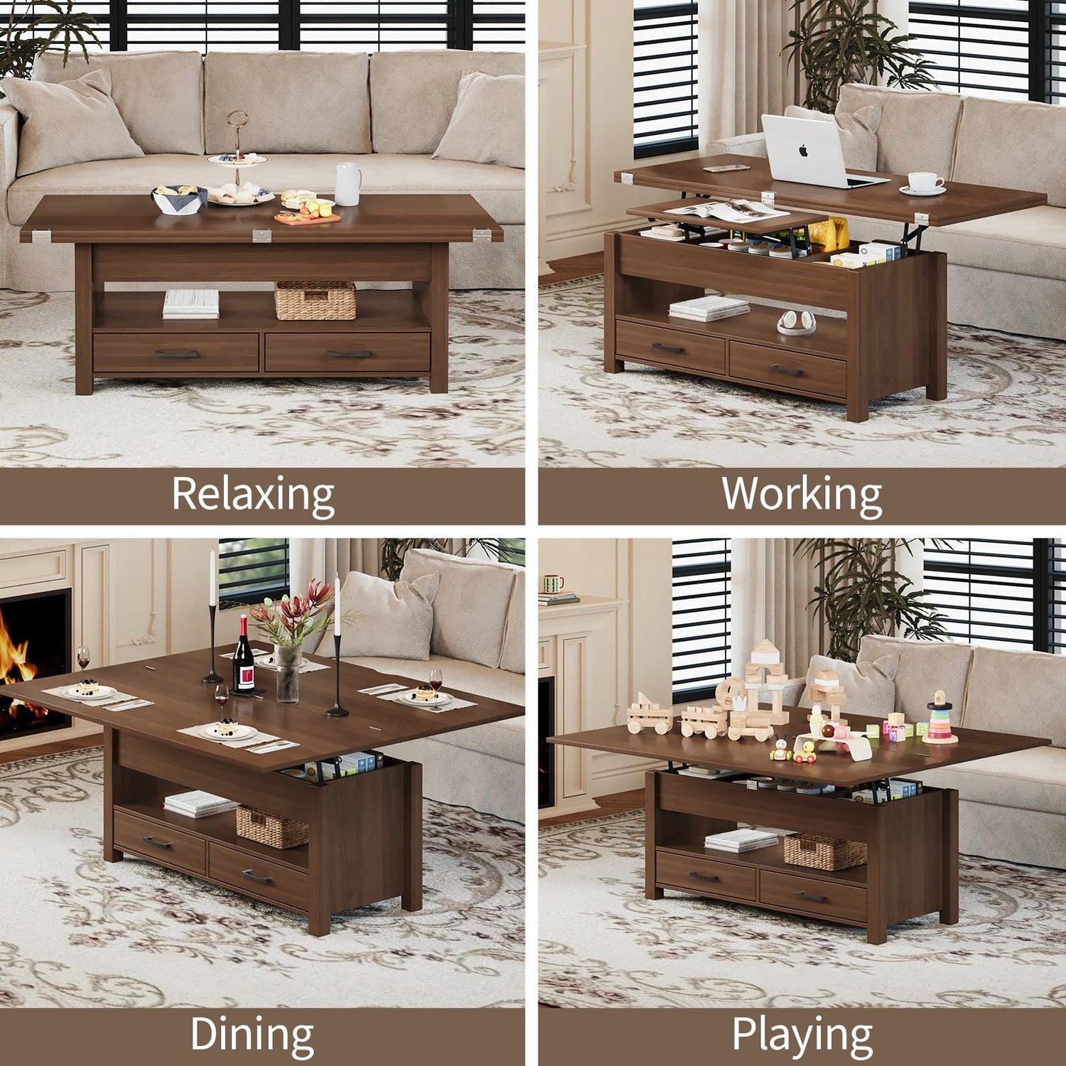- 【4-in-1 Height-Adjustable Desktop Design】The unique height-adjustable desktop design meets multiple needs: when fully extended,the large coffee table can serve as a dining table or game/coffee table for 4-8 people; when partially extended, it bacome a small coffee table that can be used as a workbench for two people simultaneously without interference; it can also be used as a coffee table with storage for miscellaneous items.