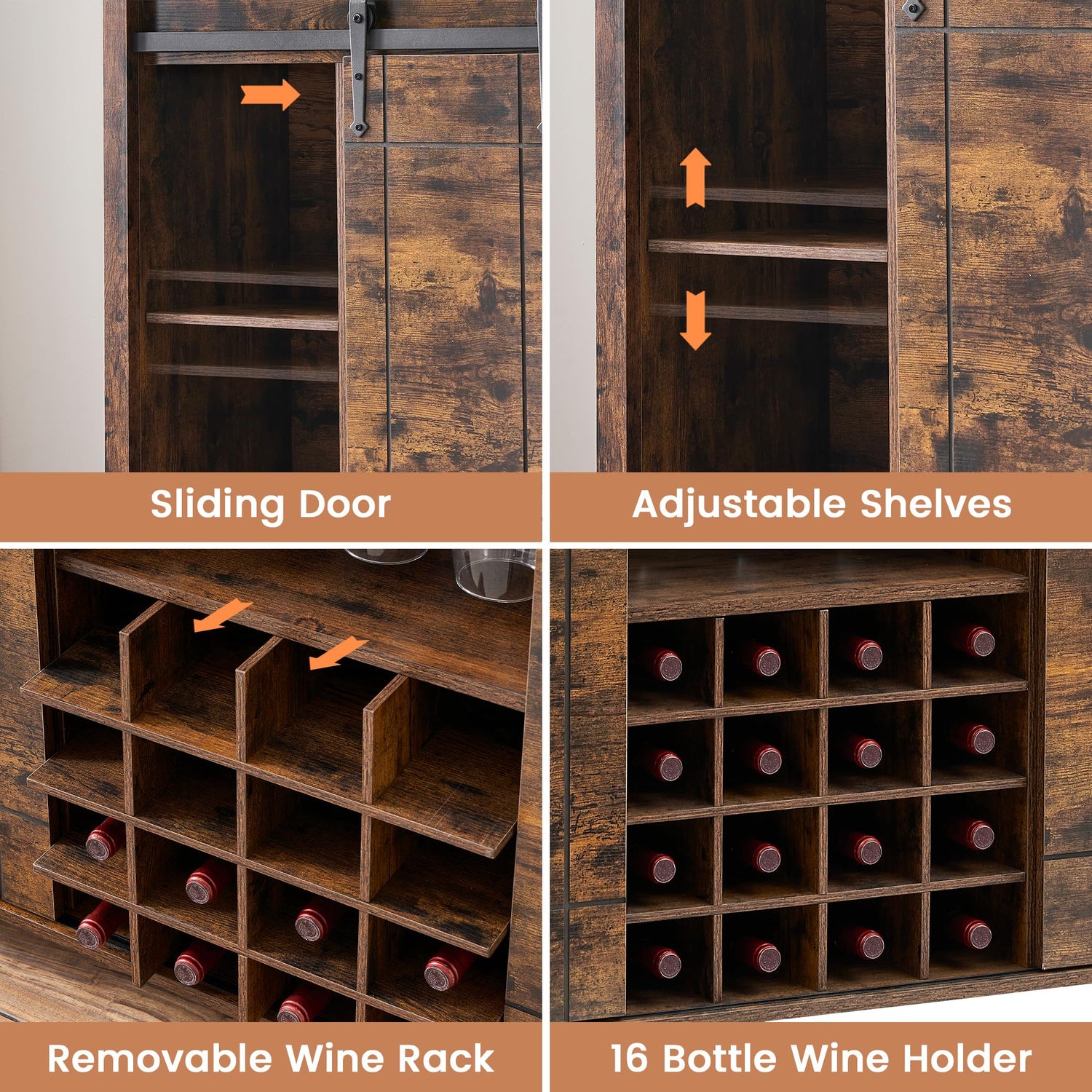 Garvee 47 in Wine Bar Cabinet Modern Liquor Whiskey Coffee Station with 16 Wine Rack and Glass Holder, Farmhouse Buffet Sideboard with Sliding Barn Door Storage for Living Dining Room, Rustic Brown