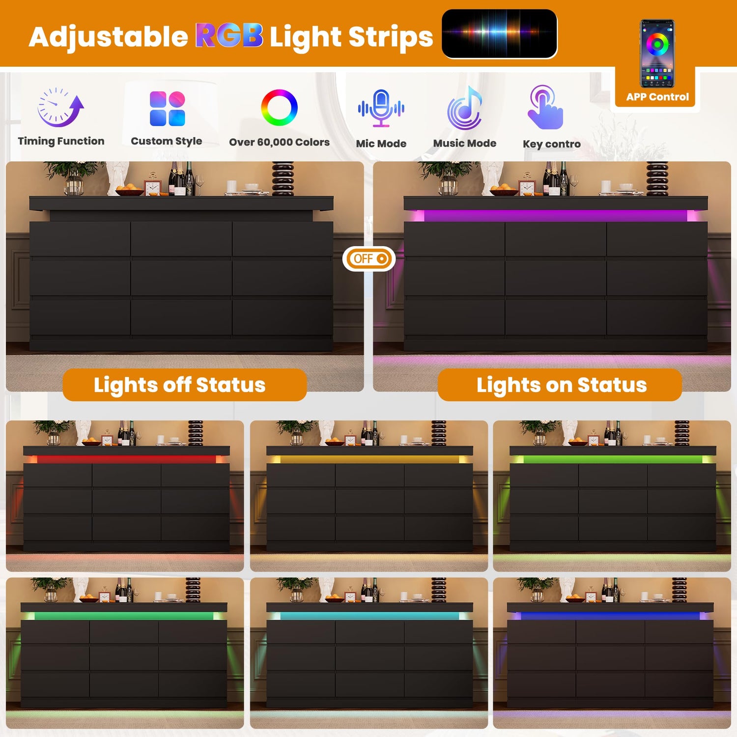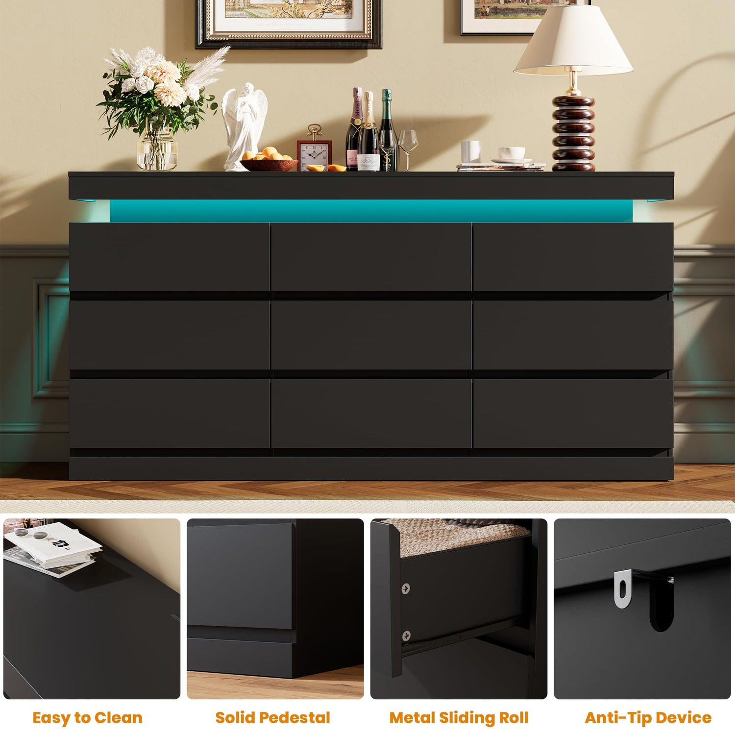 Garvee 9 Drawer Dresser for Bedroom - 63” Wide Chest of Drawers with LED Light and Charging Station, Large TV Stand Multi-Function Home Organizer for Living Room, Entryway, Hallway, Black